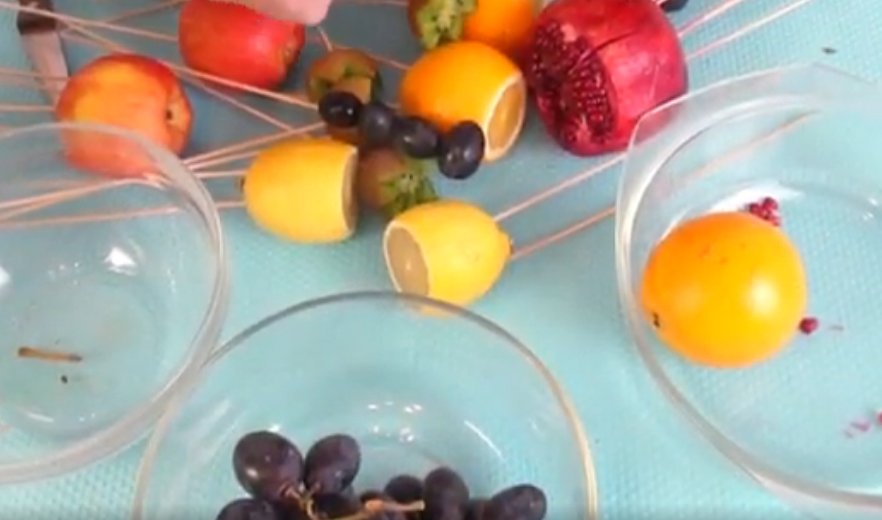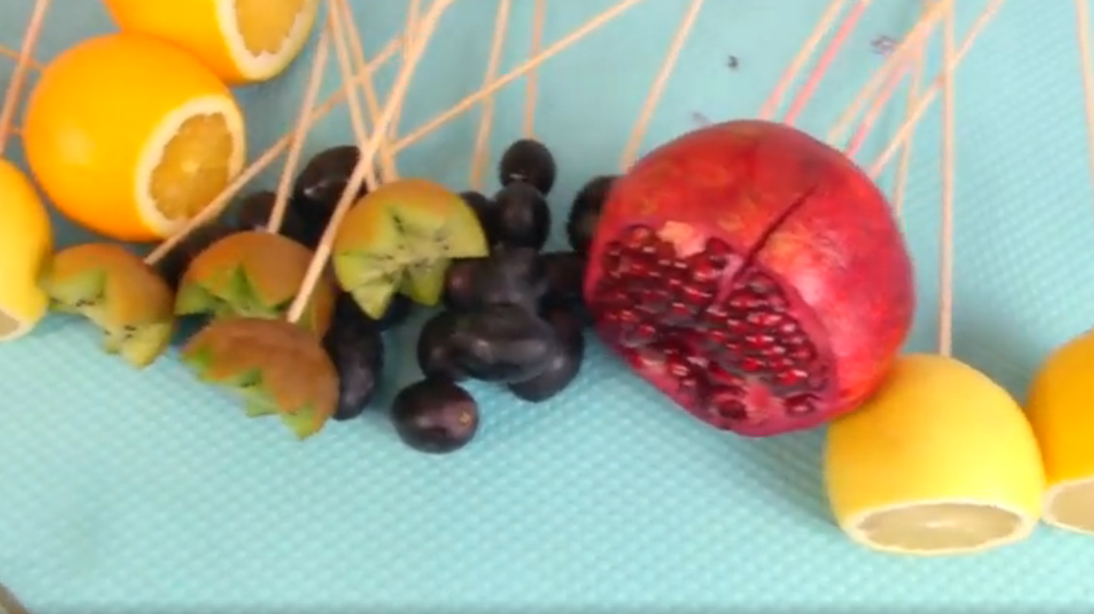 - фрукты нанизываем на 2-3 шпажки, а сладости фиксируем скотчем;