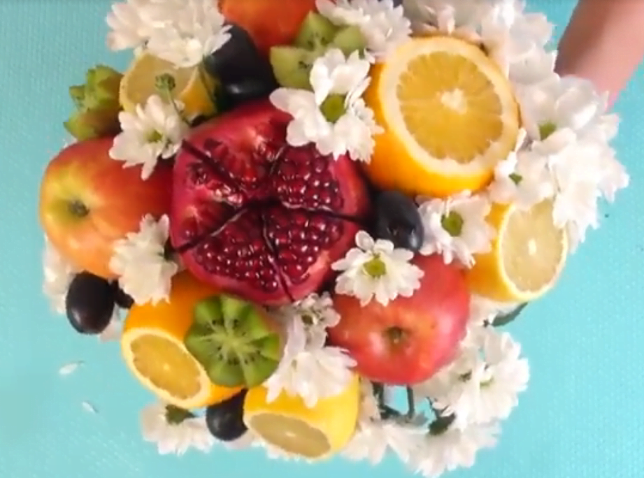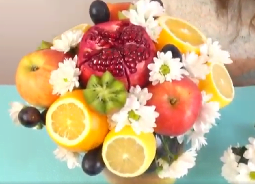 Эффектный букет из фруктов и цветов надолго запомнится виновнице торжества. Яркие краски подарка поднимают настроение. Это и красиво и обалденно пахнет. По комнате струится аромат цитрусовых, смешанный с цветочным.