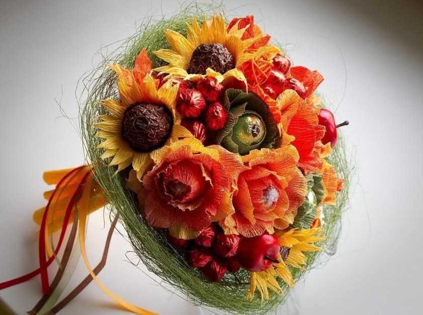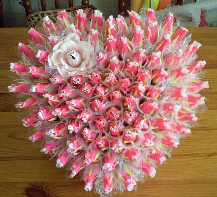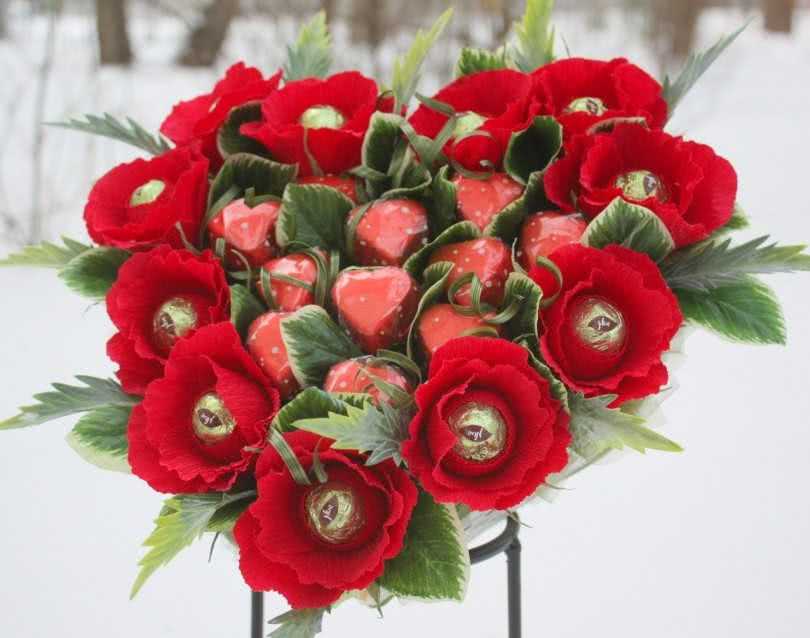 За сладкий букет в специализированных магазинах могут взять приличную сумму денег, поэтому для тех, кто владеет хотя бы начальными навыками рукоделия, есть вариант смастерить съедобное чудо самим.