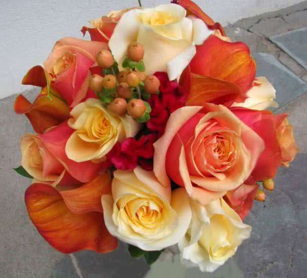 На оранжевой подстилке расположился прекрасный образец работы флориста