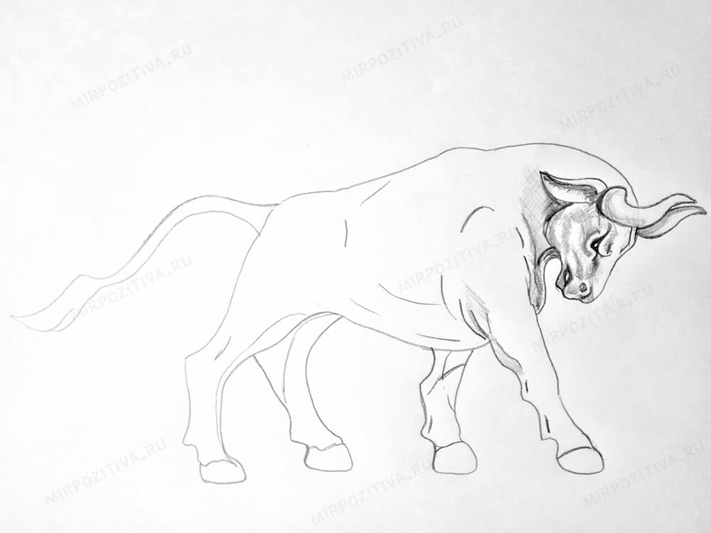 - Остается аккуратно стереть направляющие и заштриховать или раскрасить быка. Обязательно некоторые участки надо делать более темными, обозначив тени, чтобы фигура получилась объемной.