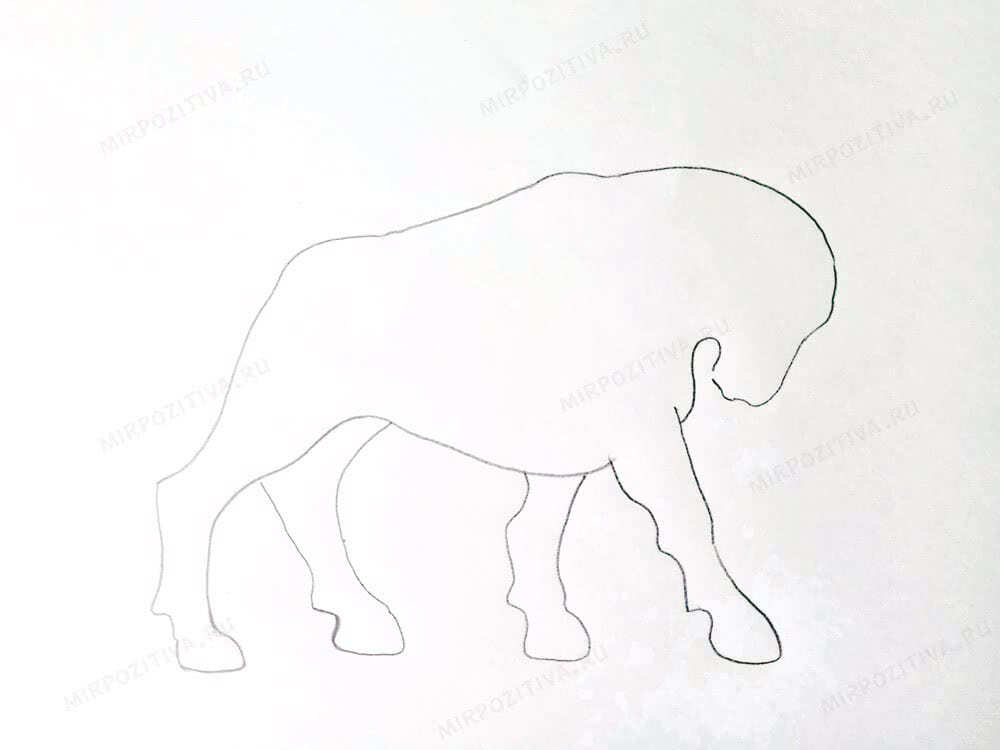 На первом этапе нарисуйте туловище быка с крупной передней частью, сужающейся к хвосту. Сбоку изобразите овальную голову, наклоненную вниз. Соедините обе части дугой — это будет шея. Прорисуйте морду.