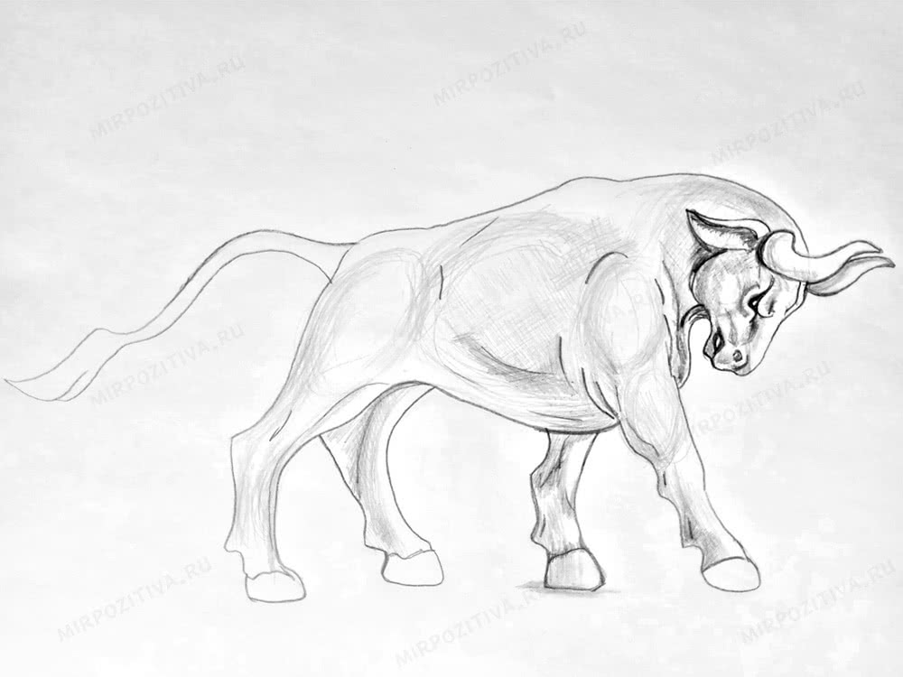 Как выполнить черно-белый рисунок быка карандашом поэтапно