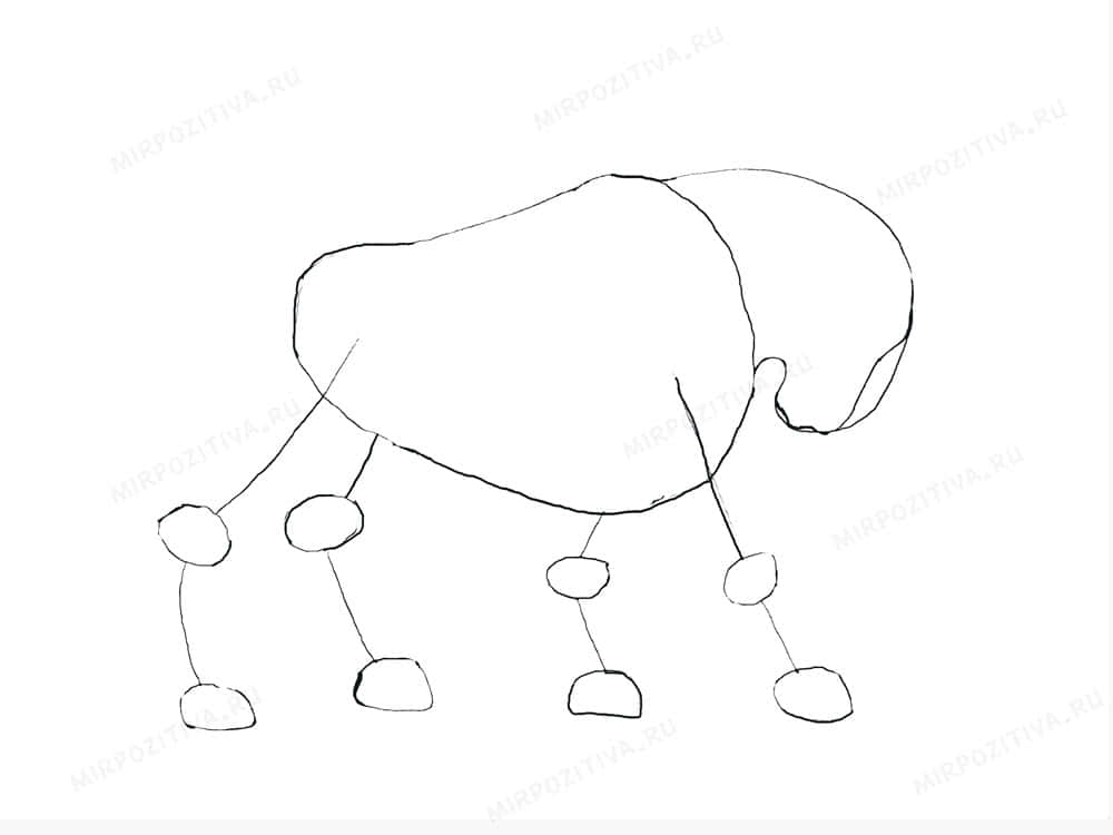 Сотрите лишние линии. Сделайте набросок конечностей: ног и хвоста. Переднюю согните в колене, у задней тоже изобразите небольшой изгиб. На концах линий нарисуйте копыта.