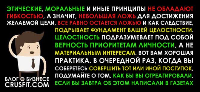 Этические, моральные и иные принципы не обладают гибкостью, а значит, небольшая ложь для достижения какой-то цели все равно остается ложью и как следствие, подрывает фундамент вашей целостности. Кража одного доллара это такая же кража, как если бы это было 100 долларов, 1000 или 100 тысяч. Целостность подразумевает под собой приверженность в первую очередь приоритетам личности, а не материальным интересам. Во главу угла ставится долгосрочное видение, а не извлечение сиюминутной выгоды. Вот хорошая практика, которая поможет вам работать над своей целостностью: «Каждый раз, когда вы думаете над тем, чтобы совершить тот или иной поступок, подумайте, как бы вы отреагировали, если бы завтра об этом написали в газетах».