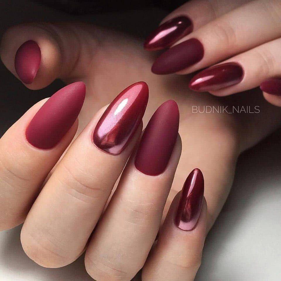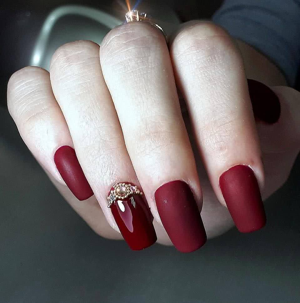 Этот вариант наиболее деловой и прекрасно подойдёт как для работы, так и для выхода в свет. Предполагает нанесение только бордового оттенка. Чтобы придать маникюру оригинальности, можно подержать ногти над паром сразу после покрытия. Таким образом, получится матовая текстура, которая особенно красиво смотрится на длинных ногтях.