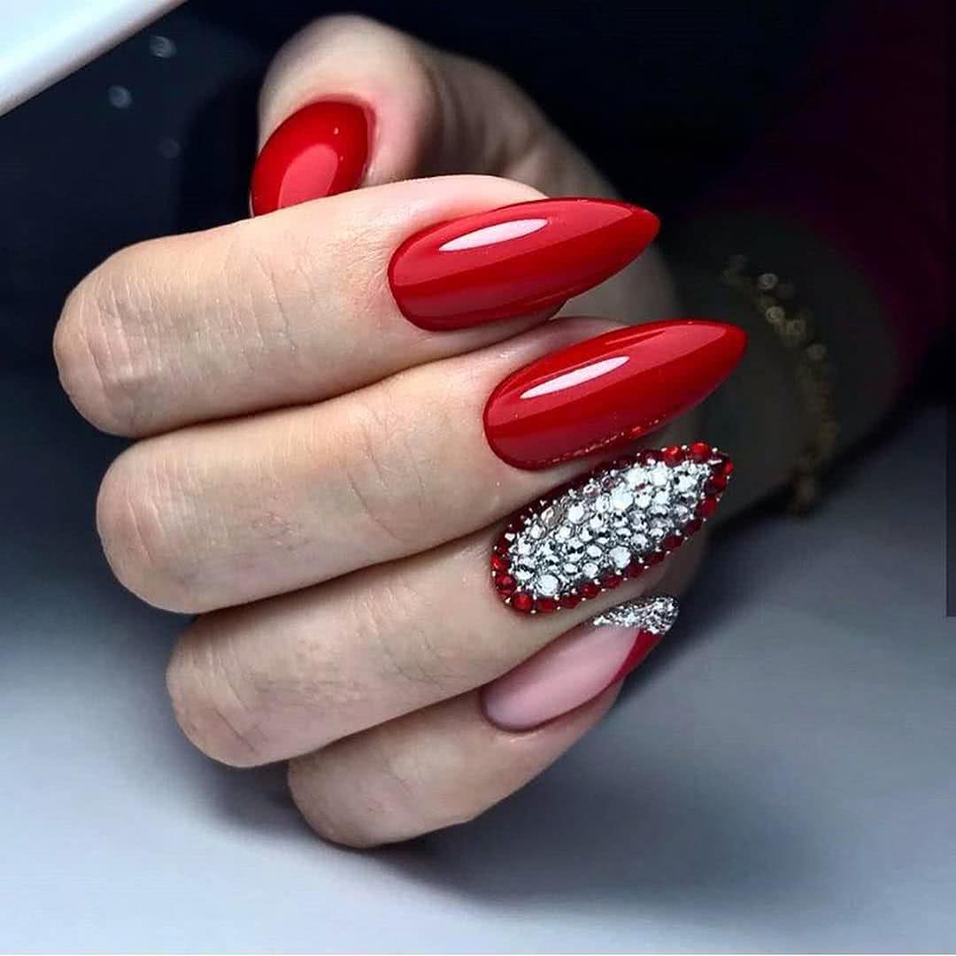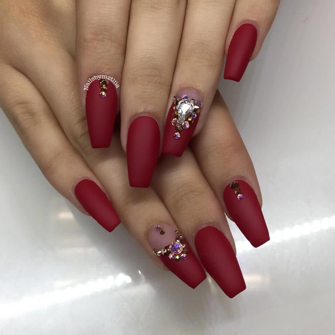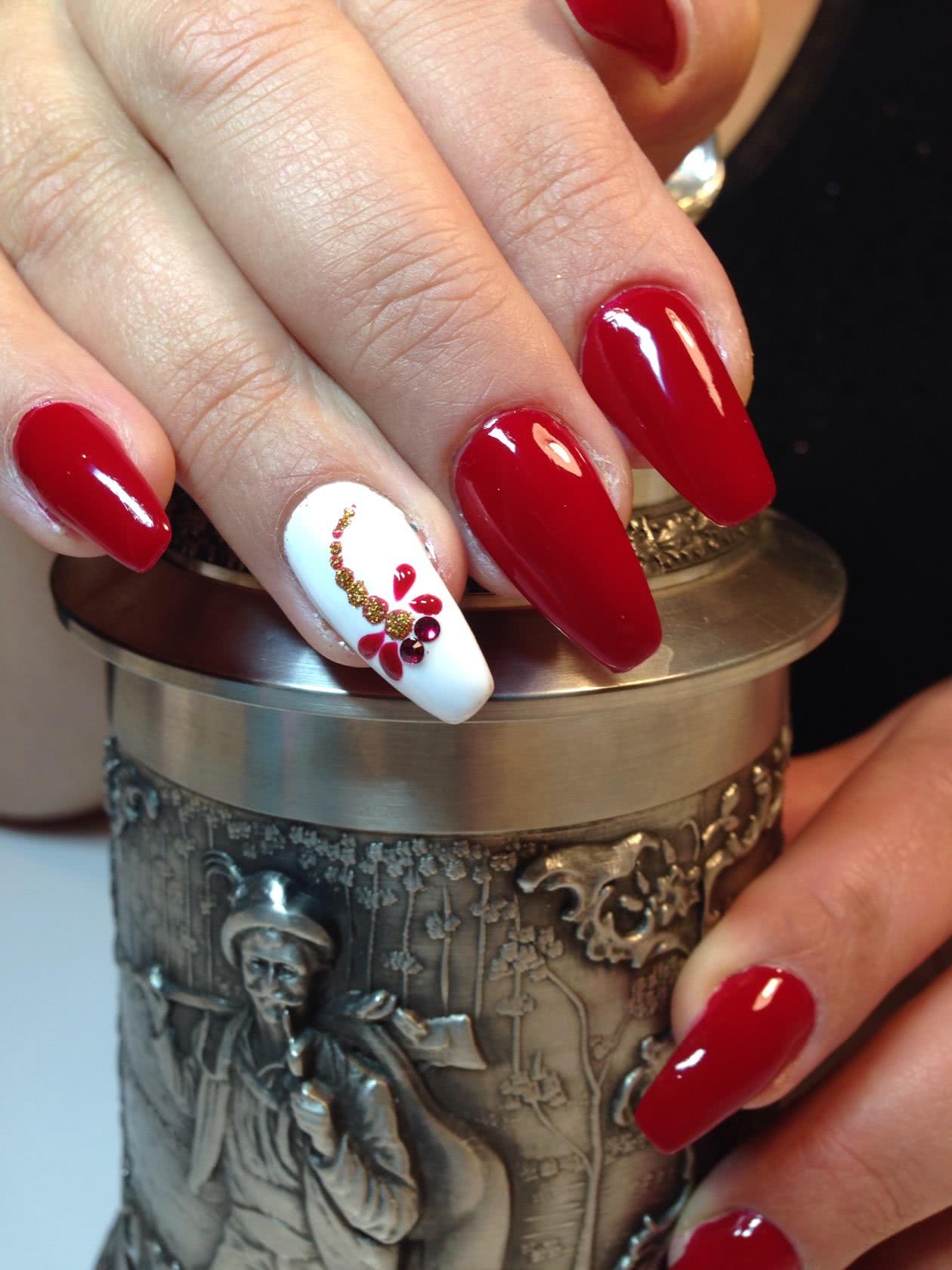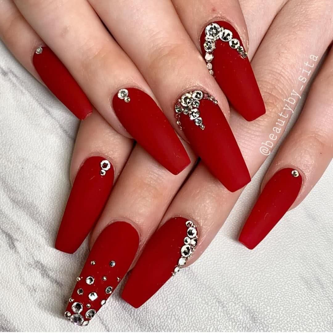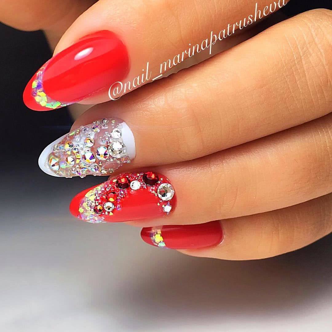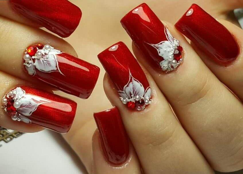Жидкие камни, кристаллы сваровски или глиттерные блики в красном цвете смотрятся еще более роскошно. Маникюр с камушками приглянется не только невестам, но и леди, готовящимся к торжественным выходам в свет.
