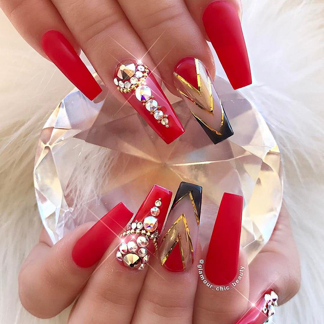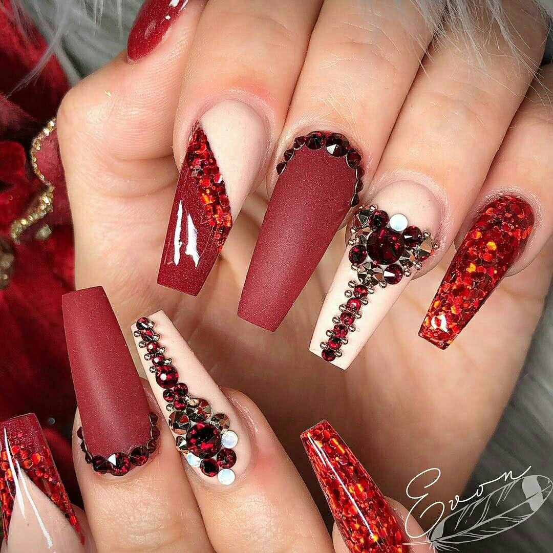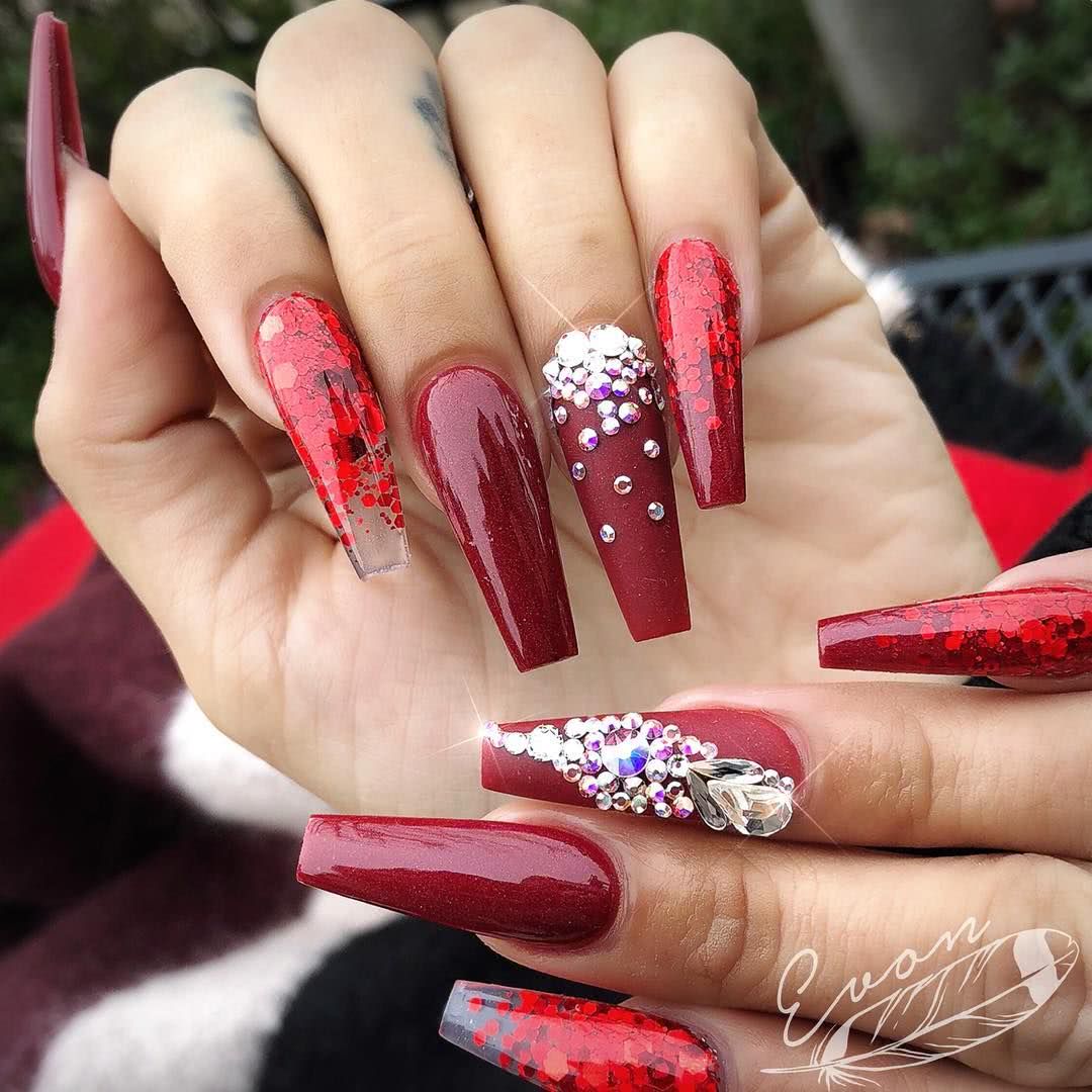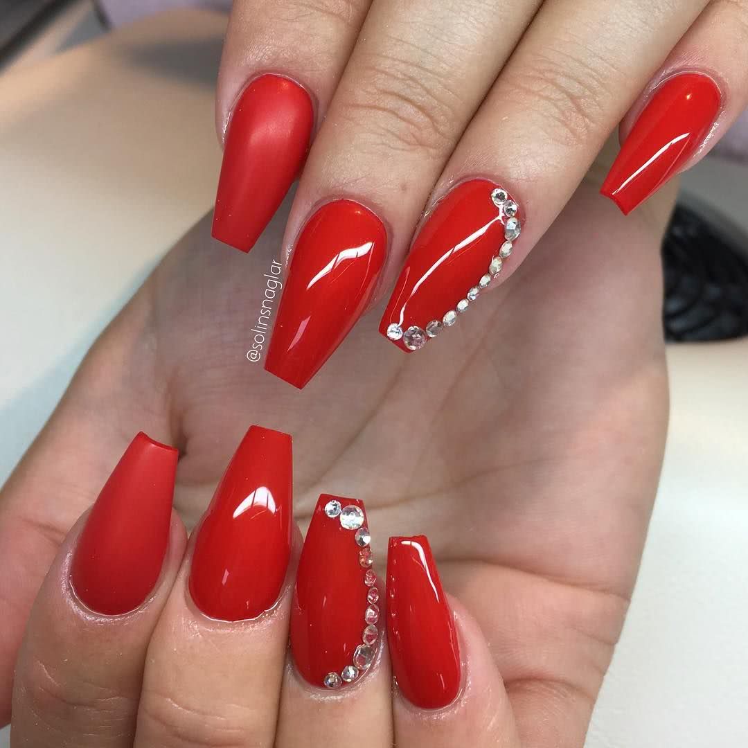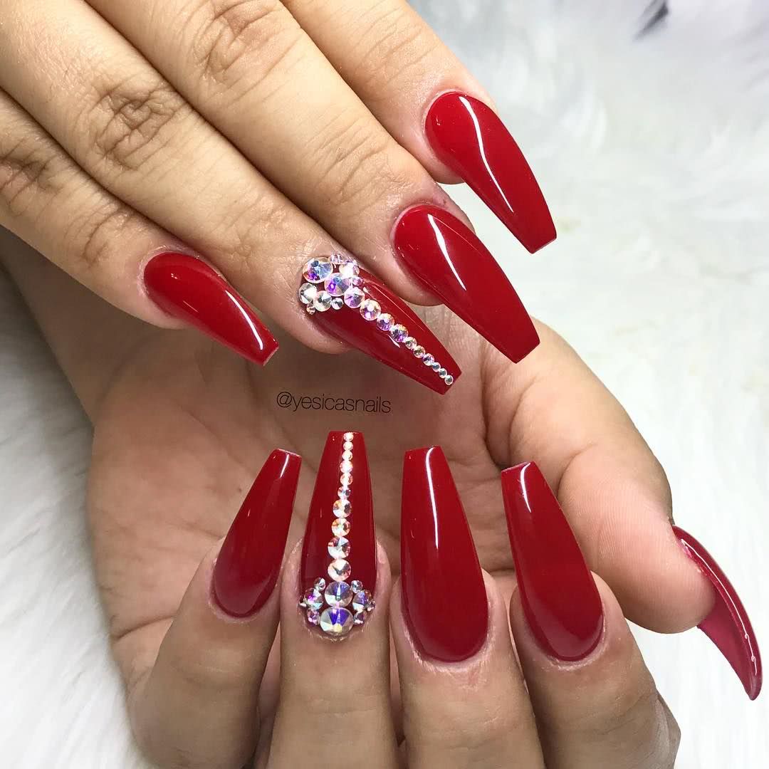 Жидкие камни, кристаллы сваровски или глиттерные блики в красном цвете смотрятся еще более роскошно. Маникюр с камушками приглянется не только невестам, но и леди, готовящимся к торжественным выходам в свет.