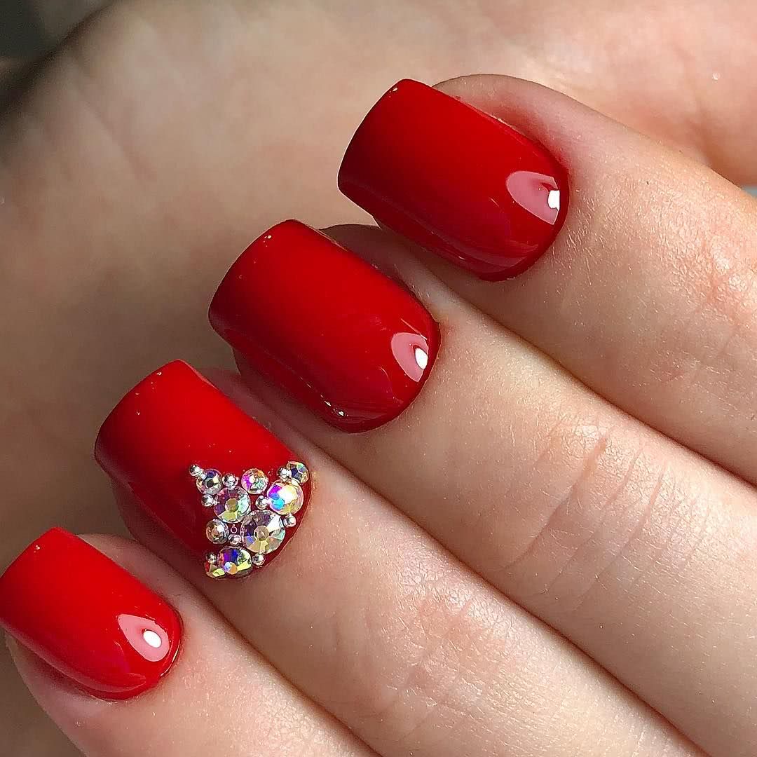 Красный маникюр со стразами — очень нежный и изысканный вариант исполнения. С этим очень трудно не согласиться.
