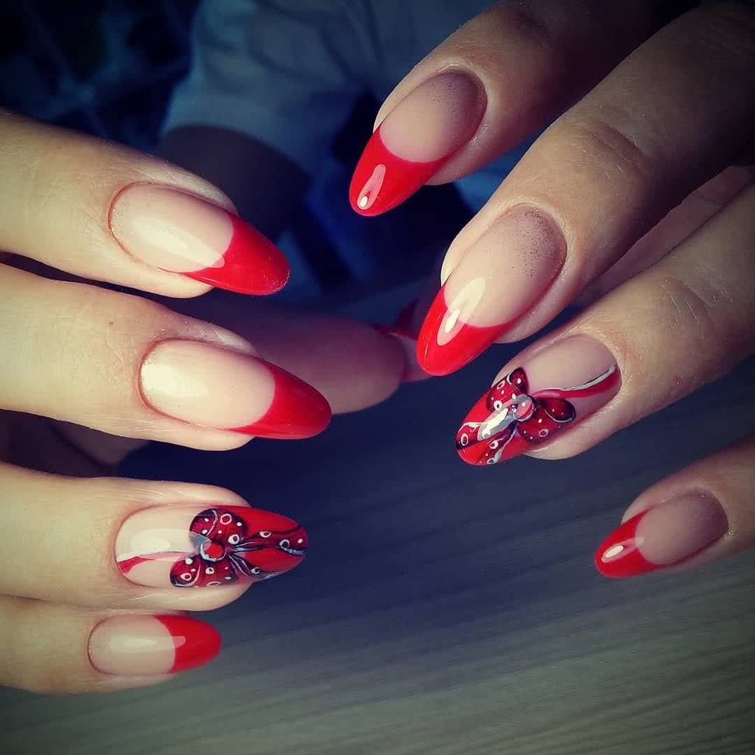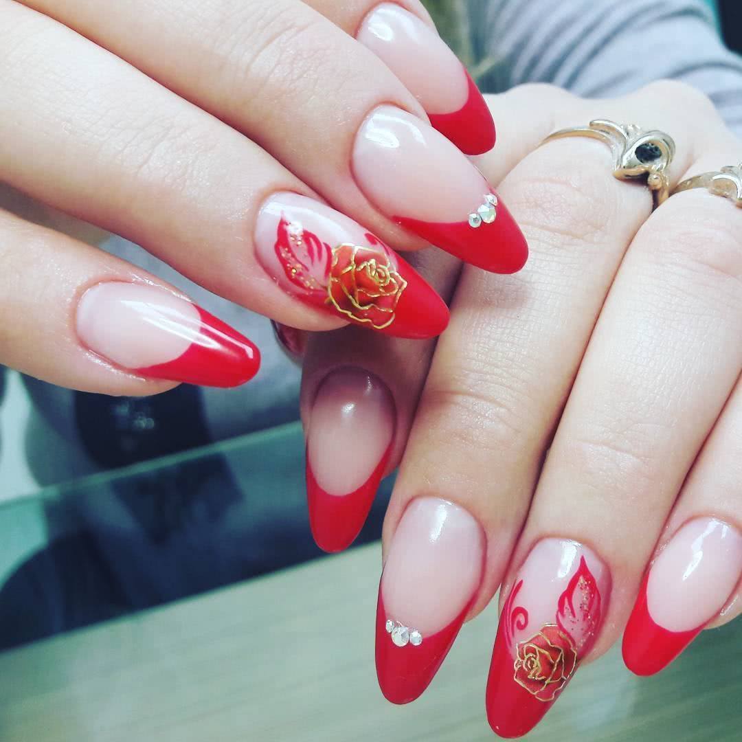 Мы все знакомы с классическим французским маникюром – классическая основа с белыми кончиками. Чтобы придать вашему французскому маникюру новое и классное обновление, поменяйте белый цвет – на красный. В результате получается сексуальный и утонченный вид ногтей, который простой, но в то же время шикарный. Красный французский маникюр идеально подходит для вечеринки или работе в офисе. Это также один из самых универсальных вариантов. Попробуйте сделать его с овальной или миндальной формой ногтей.