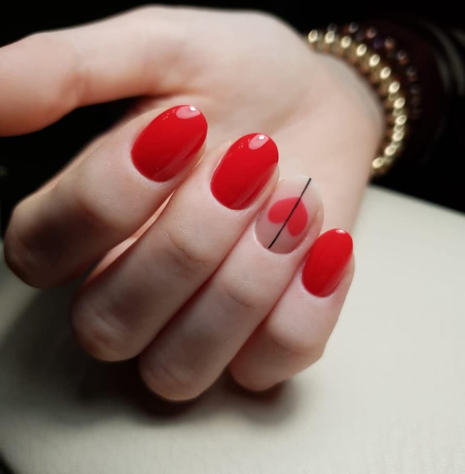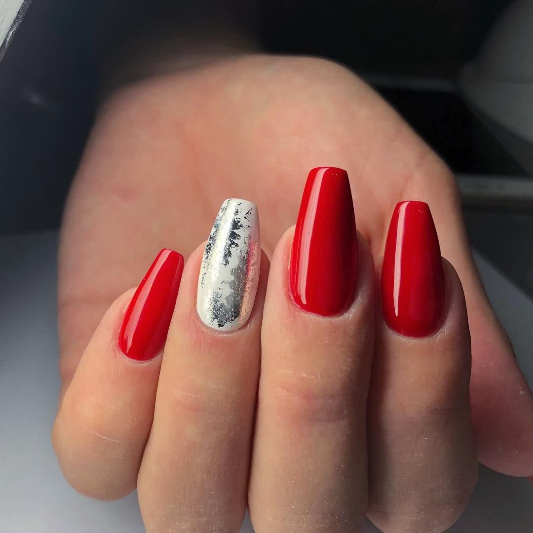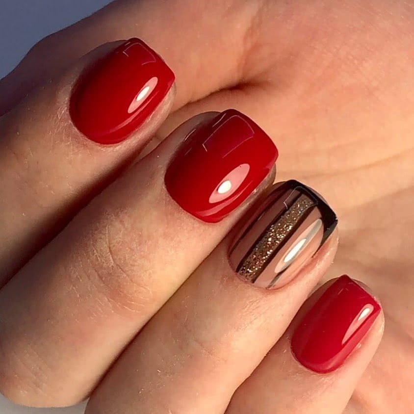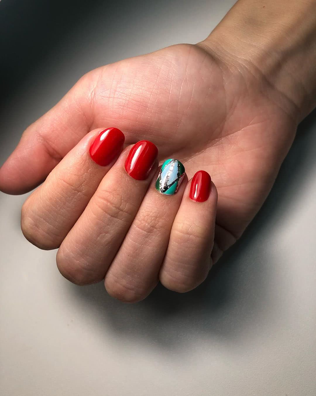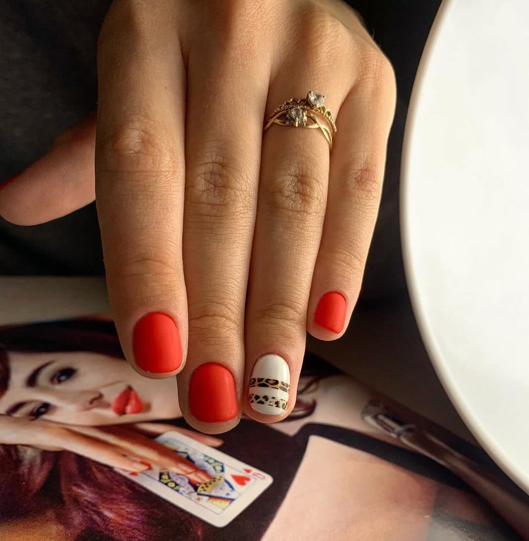 Акцентированные ногти – это отличный способ освежить простой маникюр, не переделывая каждый ноготь. Независимо от того, выбираете ли вы конкретный цвет или рисунок для своих особенных ногтей, вы можете быть уверенными, что ваш маникюр будет выделятся в любом случае. Это потому, что человеческий глаз привлекает контраст. Для своего красного маникюра выберите рисунок с дополнительными цветами, которые находятся в одной цветовой палитре оттенков с основным цветом.
