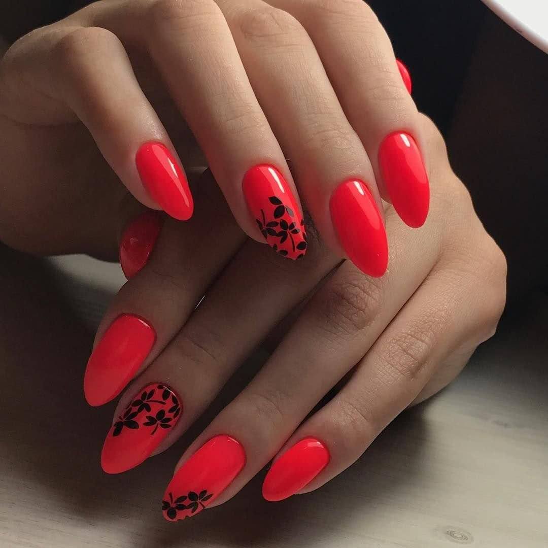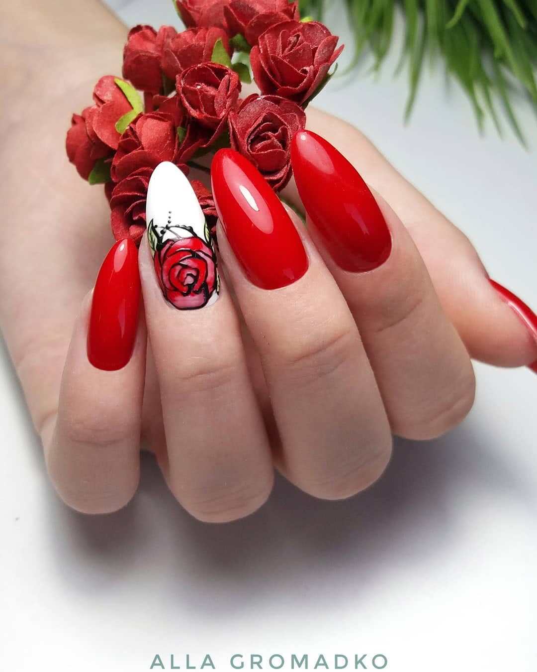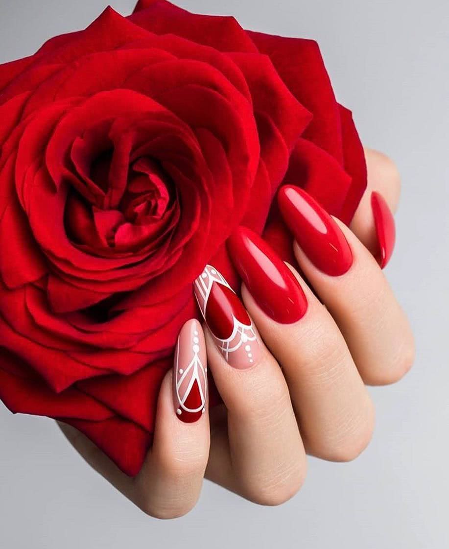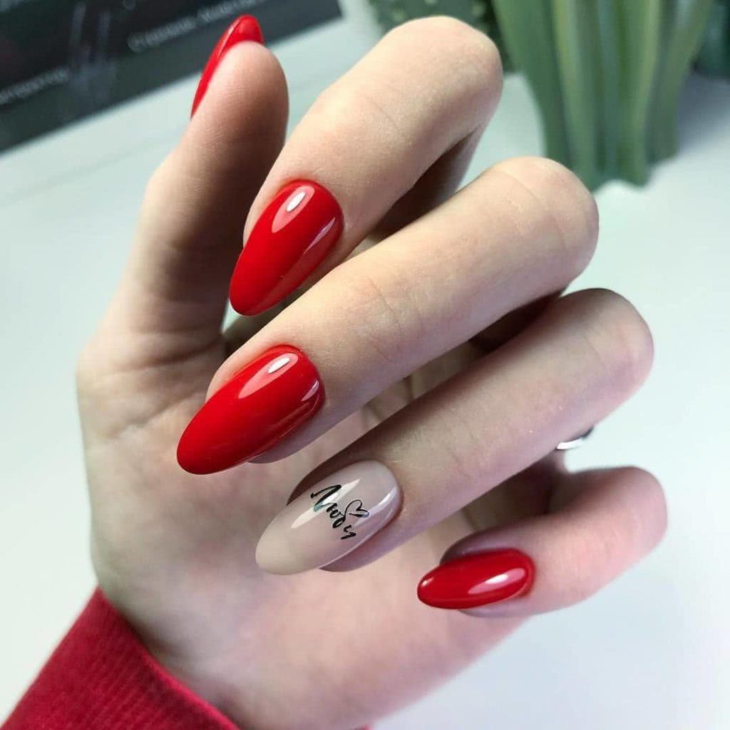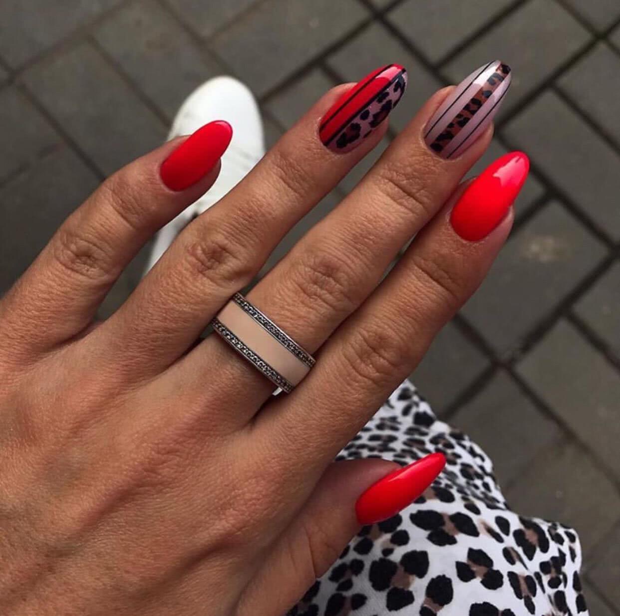 Акцентированные ногти – это отличный способ освежить простой маникюр, не переделывая каждый ноготь. Независимо от того, выбираете ли вы конкретный цвет или рисунок для своих особенных ногтей, вы можете быть уверенными, что ваш маникюр будет выделятся в любом случае. Это потому, что человеческий глаз привлекает контраст. Для своего красного маникюра выберите рисунок с дополнительными цветами, которые находятся в одной цветовой палитре оттенков с основным цветом.