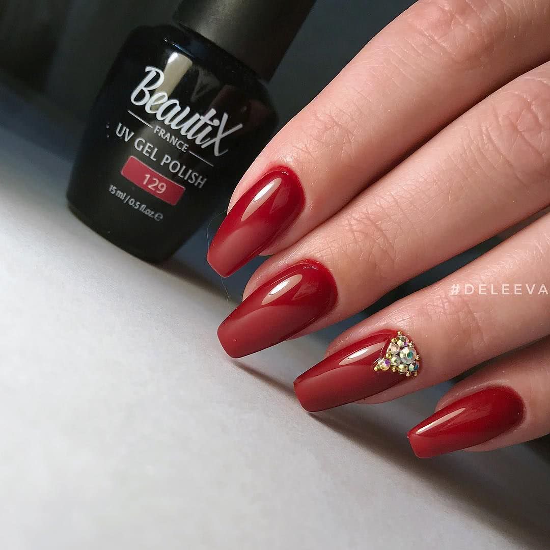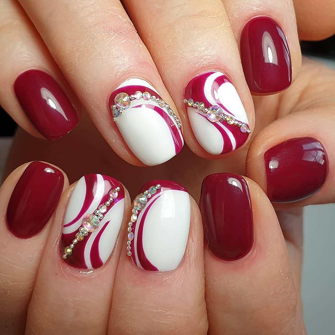 Очень красиво смотрится тёмно-красный маникюр с аккуратной полоской блестящих страз по линии кутикулы безымянного пальца. Конечно, дизайн может быть и более смелым, особенно если предполагается поход на мероприятие. Например, тот же безымянный палец можно полностью покрыть белыми и бордовыми стразами. Ещё один вариант предполагает создание луны на ногтях из страз.