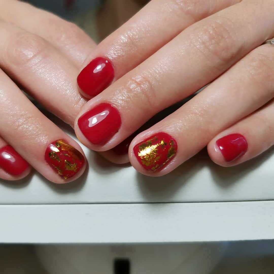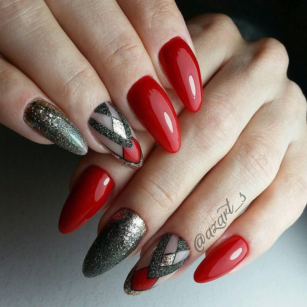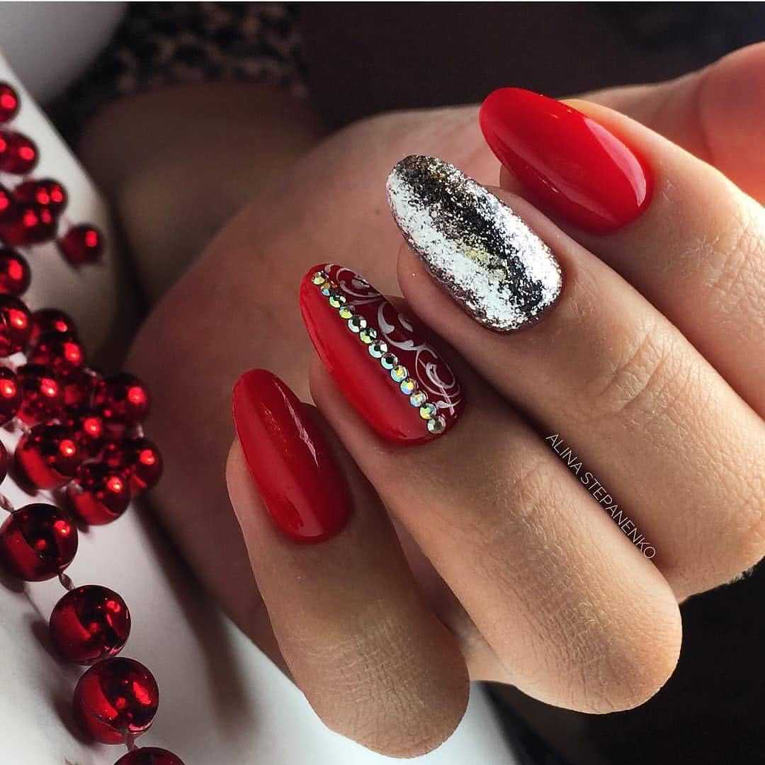 Для торжественных мероприятий и повседневной жизни подойдет сочетание красного и золотистого, серебристого тона. Оно выглядит более ярко и празднично. Но многое зависит от количества цветовых акцентов. Кто-то выбирает небольшие вкрапления в виде тонких линий. Другие же предпочитают яркое напыление или втирку, которая буквально сияет на солнечных лучах.