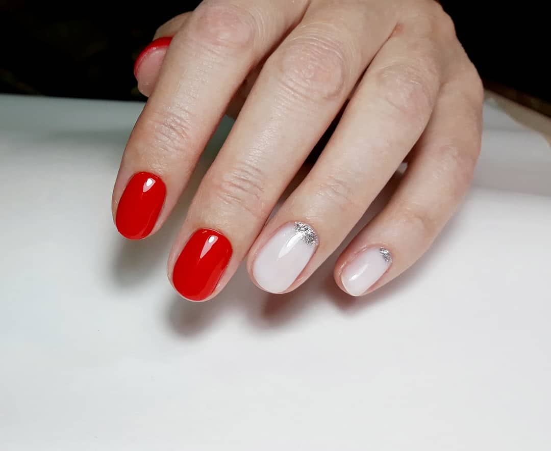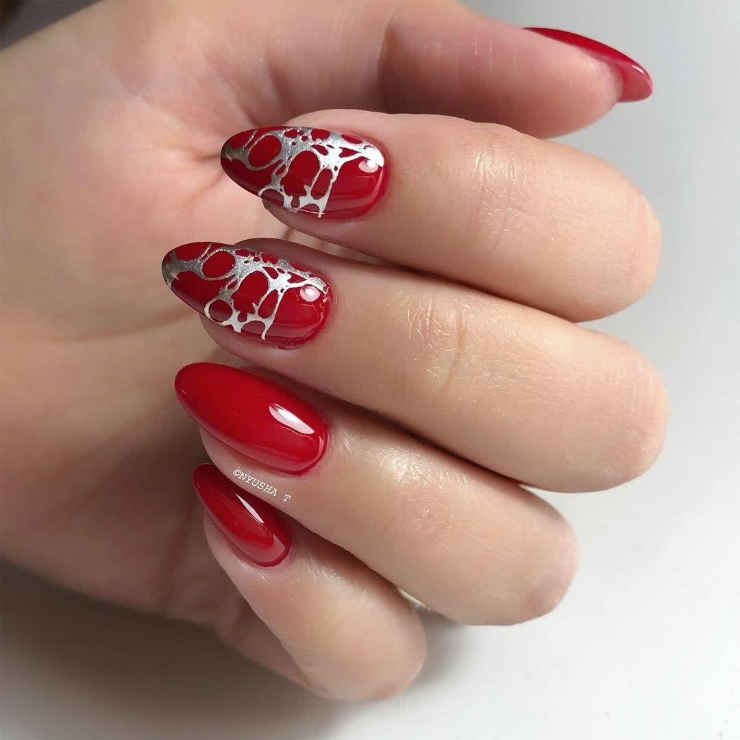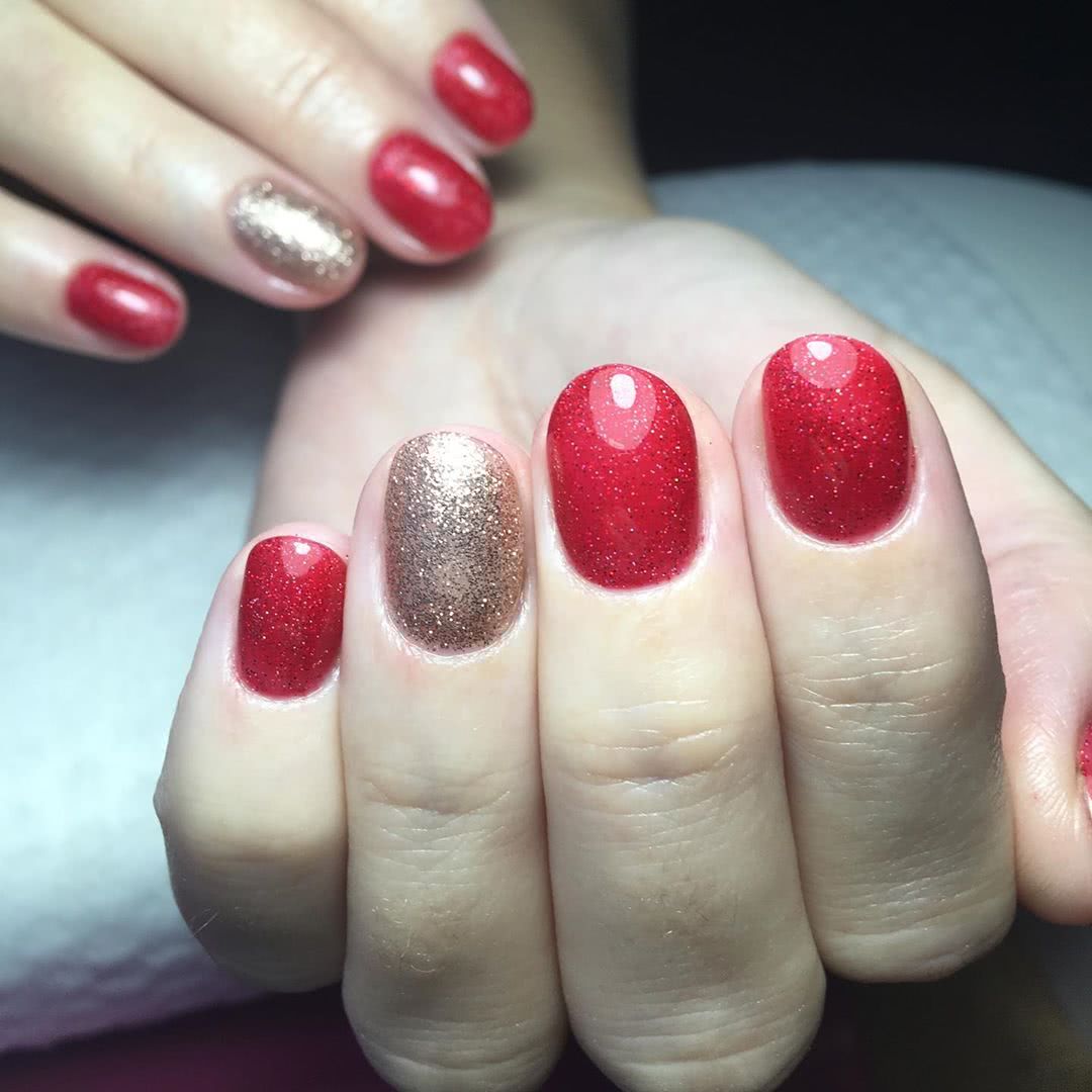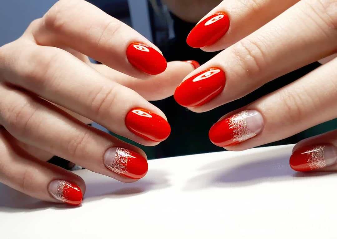 Для торжественных мероприятий и повседневной жизни подойдет сочетание красного и золотистого, серебристого тона. Оно выглядит более ярко и празднично. Но многое зависит от количества цветовых акцентов. Кто-то выбирает небольшие вкрапления в виде тонких линий. Другие же предпочитают яркое напыление или втирку, которая буквально сияет на солнечных лучах.