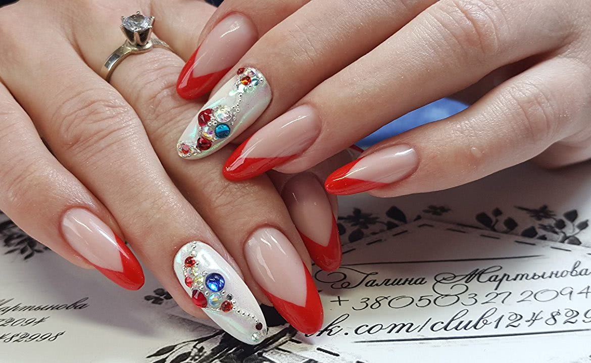 Оформление французского маникюра в красных тонах с использованием страз можно назвать очень красивой и оригинальной дизайнерской идеей, которая, не смотря на мерцание украшений и яркость палитры, всегда смотрится немного сдержанно. К тому же, этот вариант обязательно придётся по душе скромным барышням, не решавшихся ранее на подобный яркий маникюр. Самым распространённым видом красного френча считается покрытие кончика ногтевой пластины выбранным красным оттенком. Основная часть ноготка при этом остаётся прозрачной. Привлекательность такой техники заключается в форме улыбки. Вы можете отдать предпочтение классической закруглённой линии, либо немного поэкспериментировать и оформить треугольную, скошенную или даже очень широкую улыбку, которая будет занимать половину всего ногтя. Последнее предложение актуально для длинных ноготков. Стразы при этом красиво подчеркнут границу между цветным и прозрачным покрытием либо могут располагаться в виде небольших узоров на нескольких пальцах.