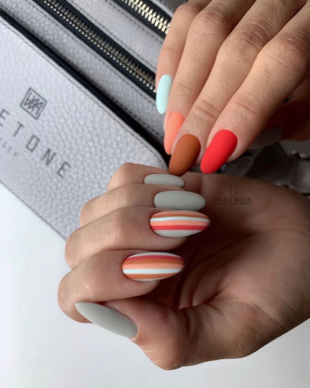 Такой вариант предполагает сочетание нескольких цветов. Например, два ногтя красятся в бордовый цвет, остальные в белый, чёрный и бежевый. Прекрасным вариантом станет совмещение марсалы, розового и белого. Вариантов может быть много, все зависит от фантазии клиентки.