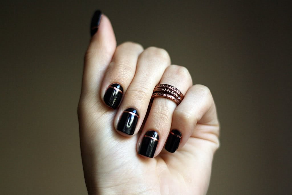 При нанесении черного лака в качестве основного тон, вам стоит быть очень аккуратными. Такой вид маникюра должен особенно выделять задуманные границы. Помните, что для выполнения золотистой полоски в верхней части ноготка не подойдут ногти короткой длины. Это будет смотреться неопрятно и невыразительно. Изюминкой маникюра является выделение золотой полоской одного ноготка. Тонкая, драгоценная нить в верхней части ногтя на каждом пальчике выглядит изысканно. Этот вариант маникюра подходит как для деловых встреч, так и для торжественных событий. Если у вас при самостоятельном создании черно-золотого нейл-арта существует возможность воспользоваться специальными трафаретами, которые делят ногтевую пластину на три части, то будет оригинально смотреться выделенная посередине золотая полоса в обрамлении двух черных по бокам.