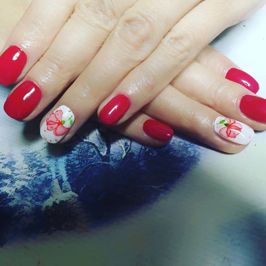 Красный маникюр на коротких ногтях практически ничем не отличается от нейл-артов, выполненных на «длине». Исключение составляют только узоры, они должны быть крупнее, без мелких деталей. На коротких ногтях отлично смотрятся нейл-арты с флористикой, с серебром, с геометрией.