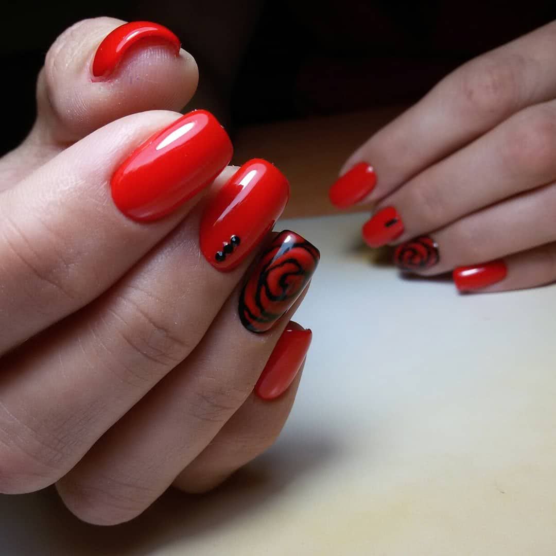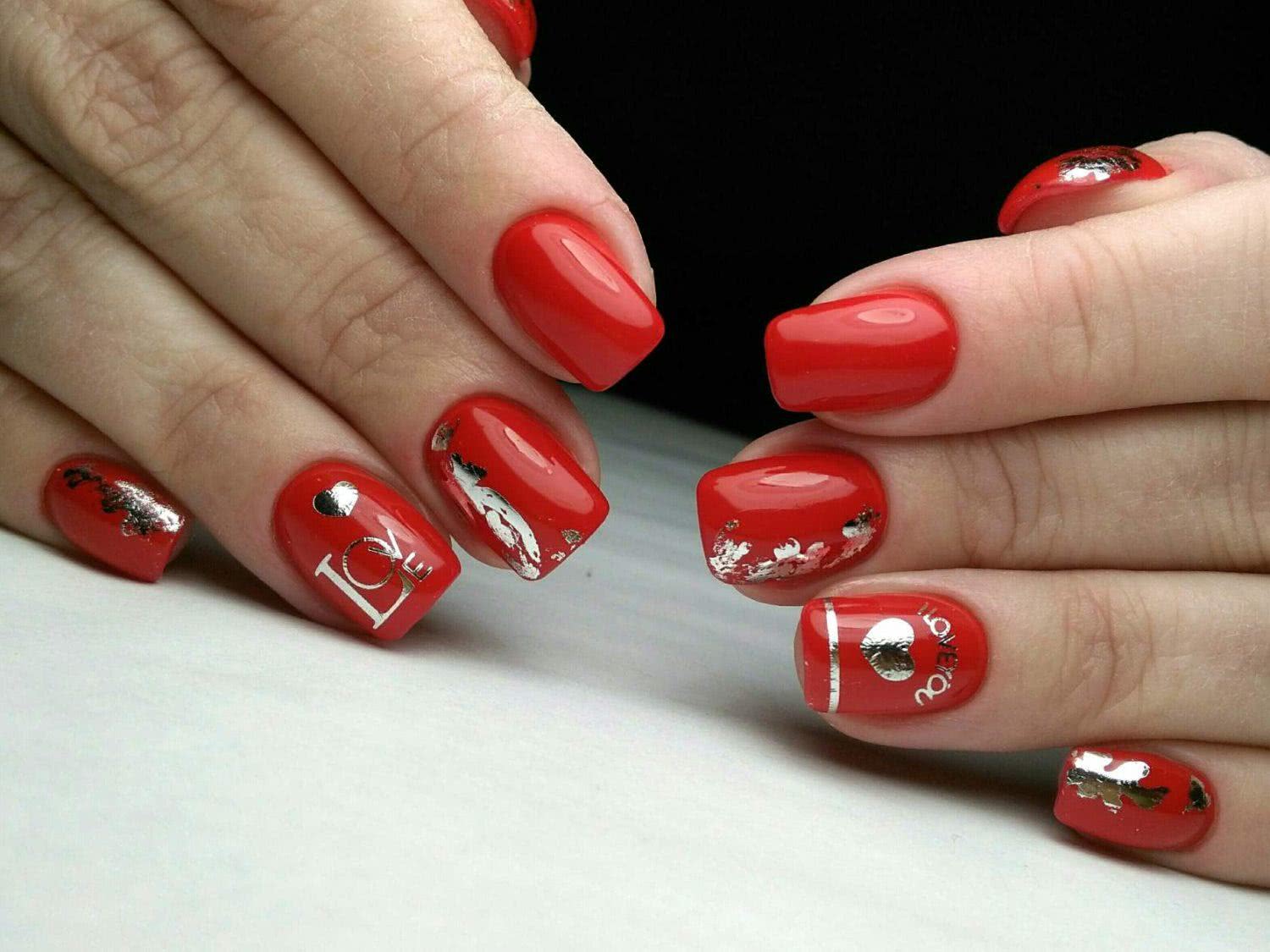 Очень нежно и женственно смотрится маникюр с пайетками, со стразами и слайдерами. Что касается формы ногтей, то с красным цветом шикарно выглядит квадрат и овал. На квадратных ногтях можно выполнить красный дизайн с белым и черным гель-лаком, со слайдерами и надписями.