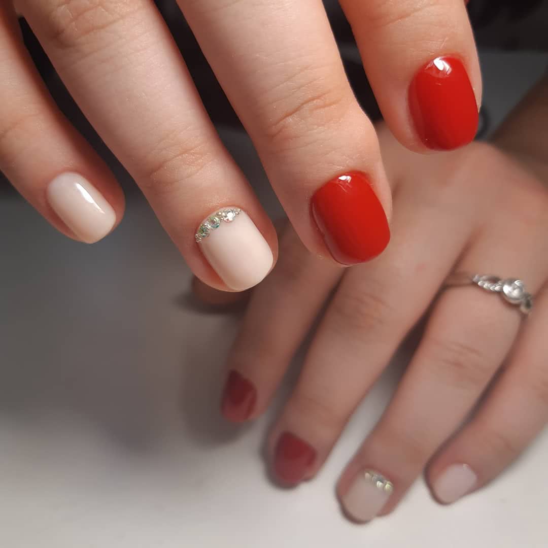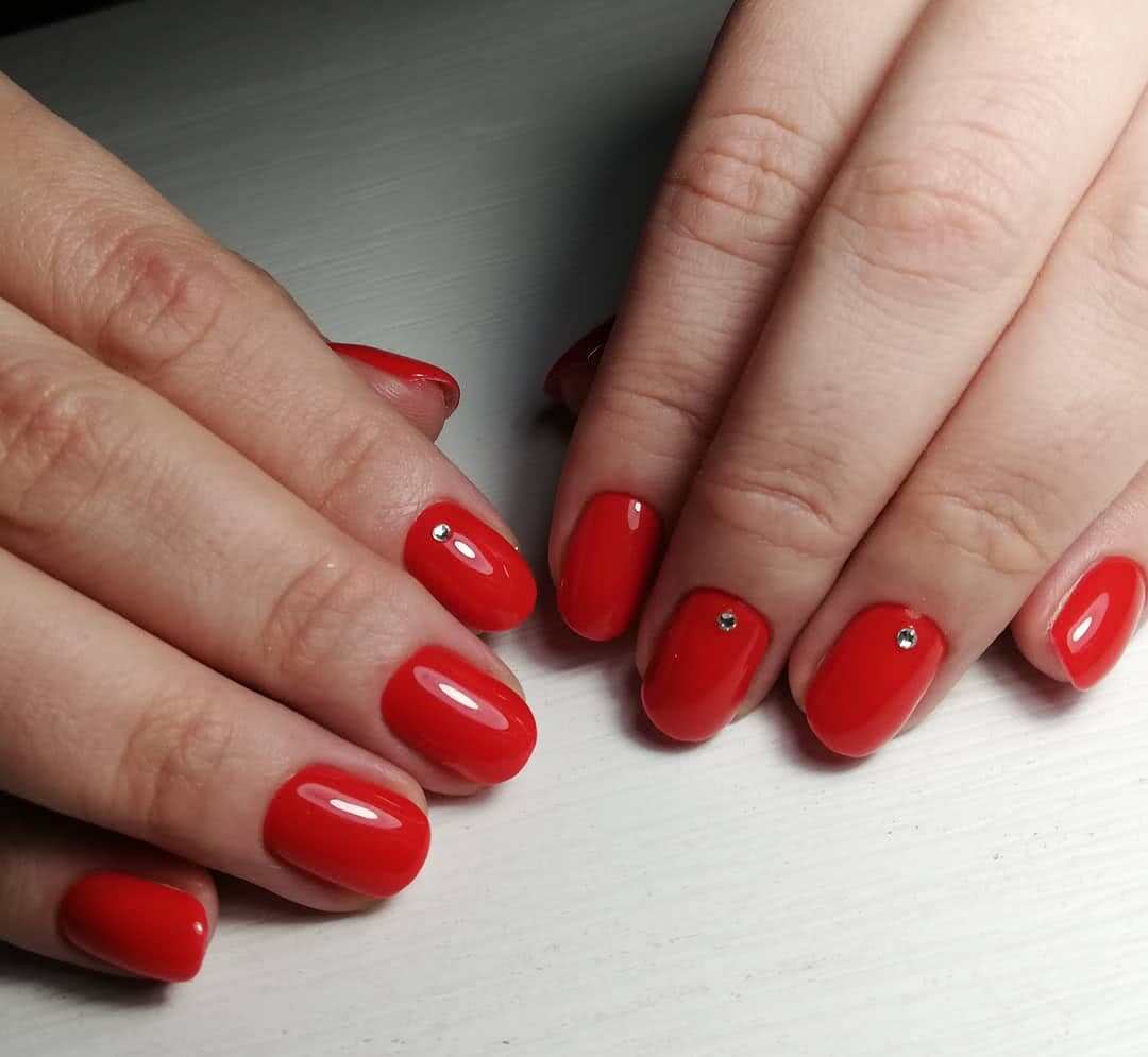 Длина ногтей в современном мире вовсе не играет никакого значения. Если ранее привлекательным считался лишь маникюр на основе длинных ногтей, то сейчас все изменилось. Опытный нейл-мастер всегда сможет реализовать любую, даже самую необычную идею. К тому же, короткие ноготки более комфортные в повседневной жизни. Покрытие красного цвета в данном случае особенно уместное. Такой маникюр смотрится стильно, но при этом не вульгарно. Что касается использования декора, то здесь главное — не переусердствовать. Выбирайте прозрачные камушки небольшого размера. Это самый оптимальный вариант, который хорошо смотрится с любым оформлением.