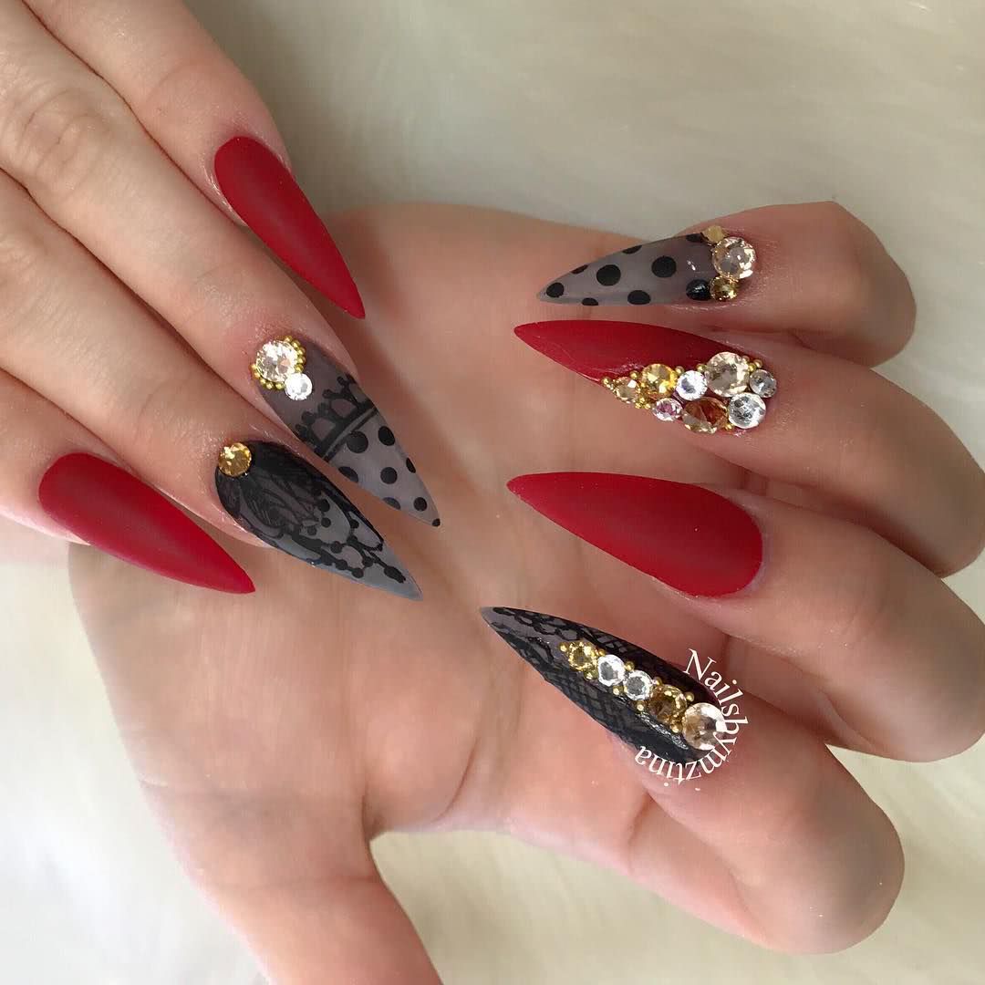 Бежево красный маникюр со стразами – элегантность и простота в каждой детали. В то время как вариант с черным кружевом уже более дерзкий, сексуальный и зазывающий.