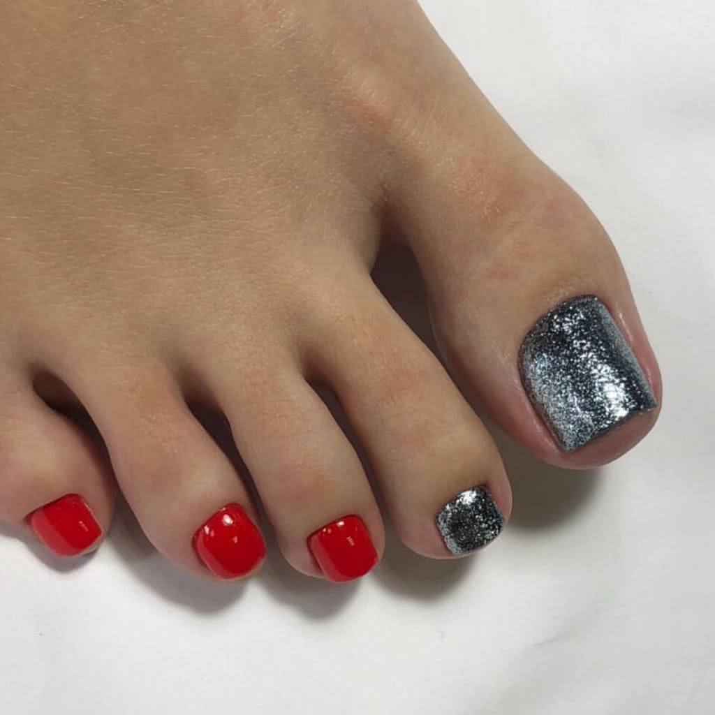 - черный педикюр с красным глиттером – отличное решение для праздничных нейл-артов. Глиттер отлично заменяет стразы, камифубуки и другой блестящий декор.