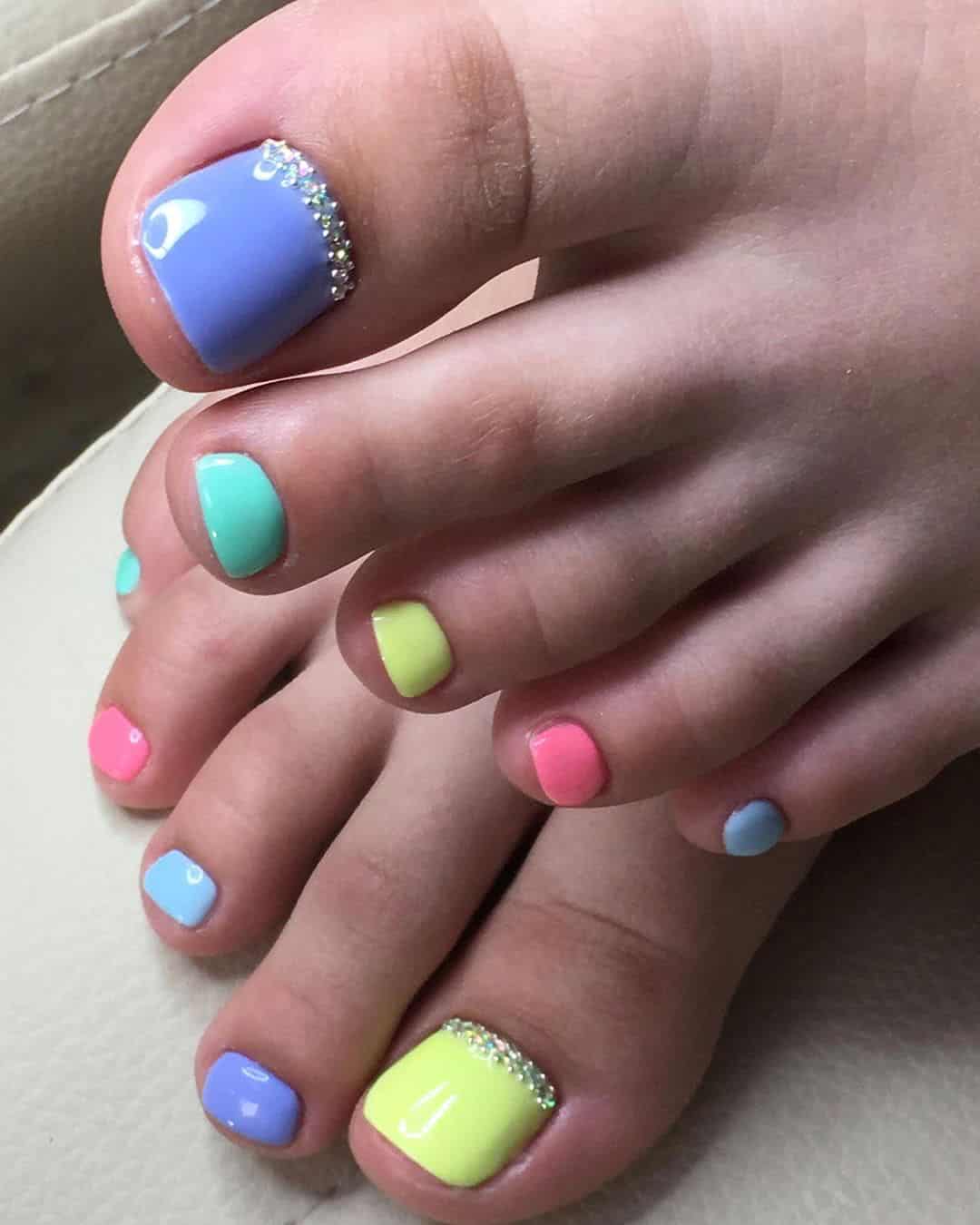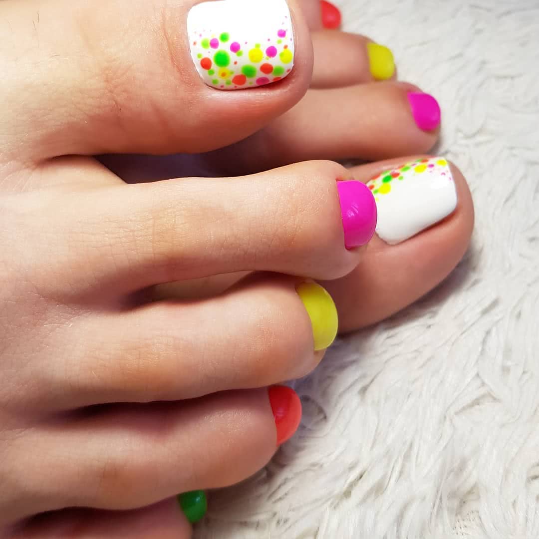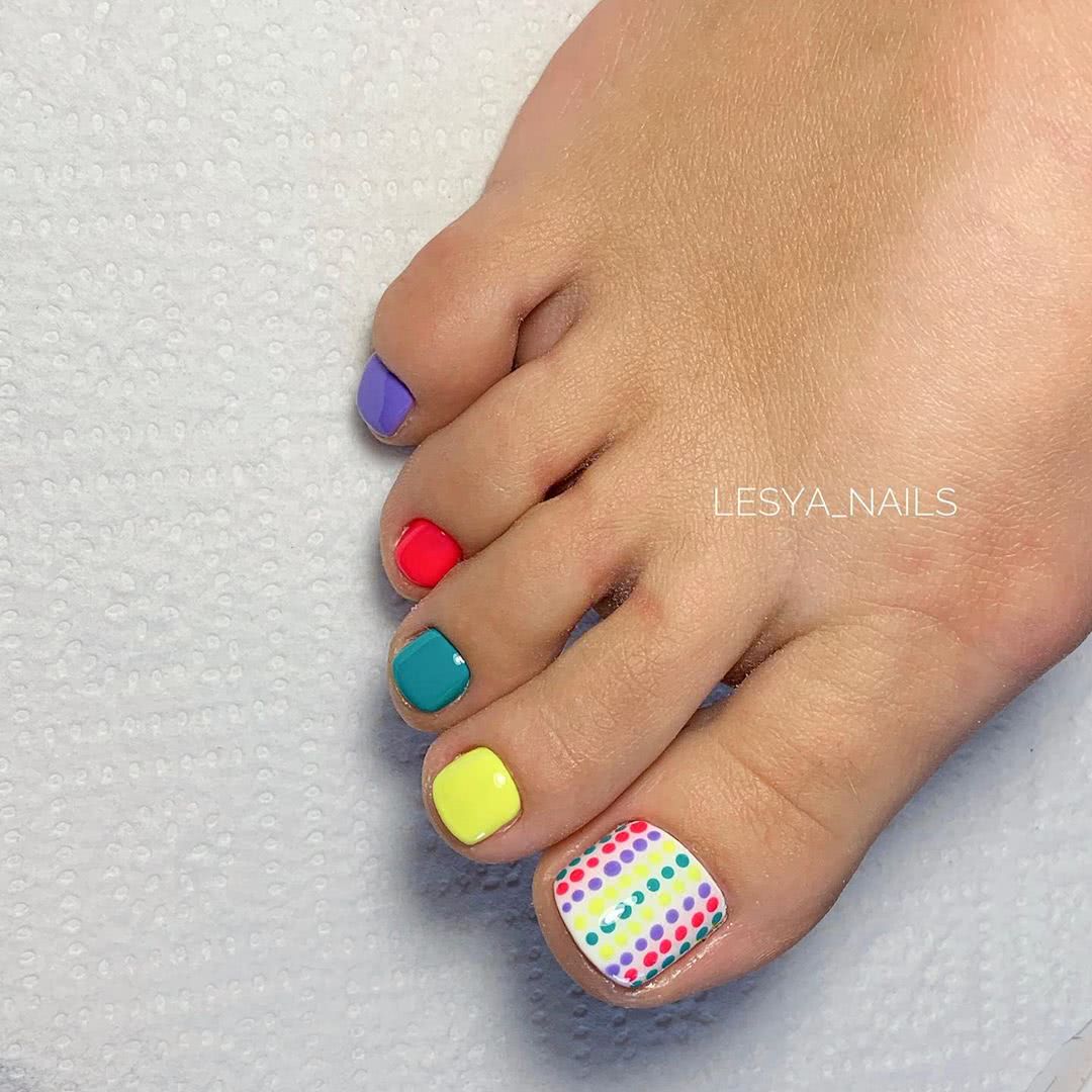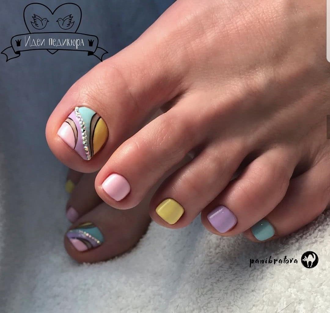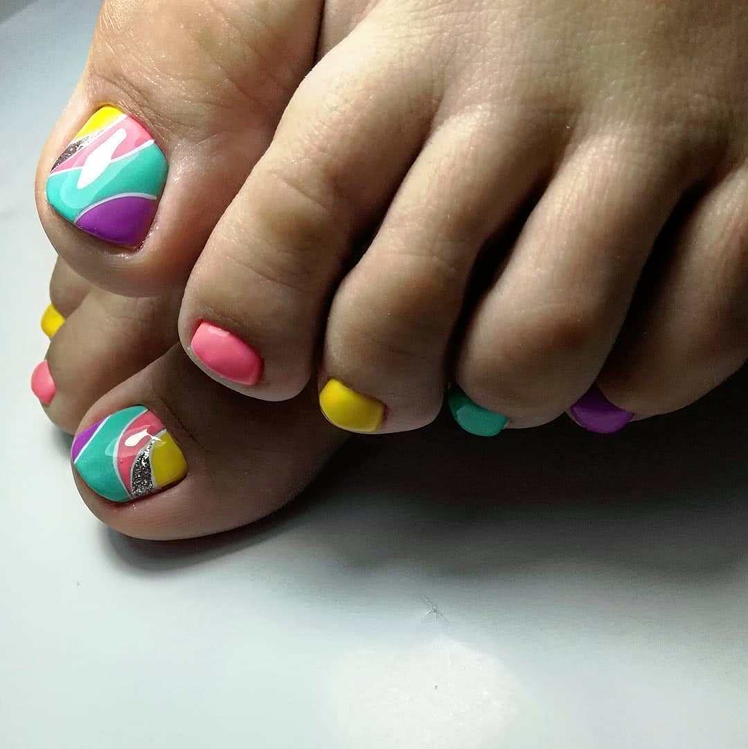 Разноцветные покрытия для педикюра подойдут к любому сезону и самому разному поводу. Такой дизайн пригодится не только во время отдыха или праздника, но и для поднятия настроения в домашней обстановке. Оформление в нескольких сочетающихся между собой оттенках сделает образ ярким, гармоничным и невероятно модным. Остаться незамеченной с данным педикюром будет просто невозможно.