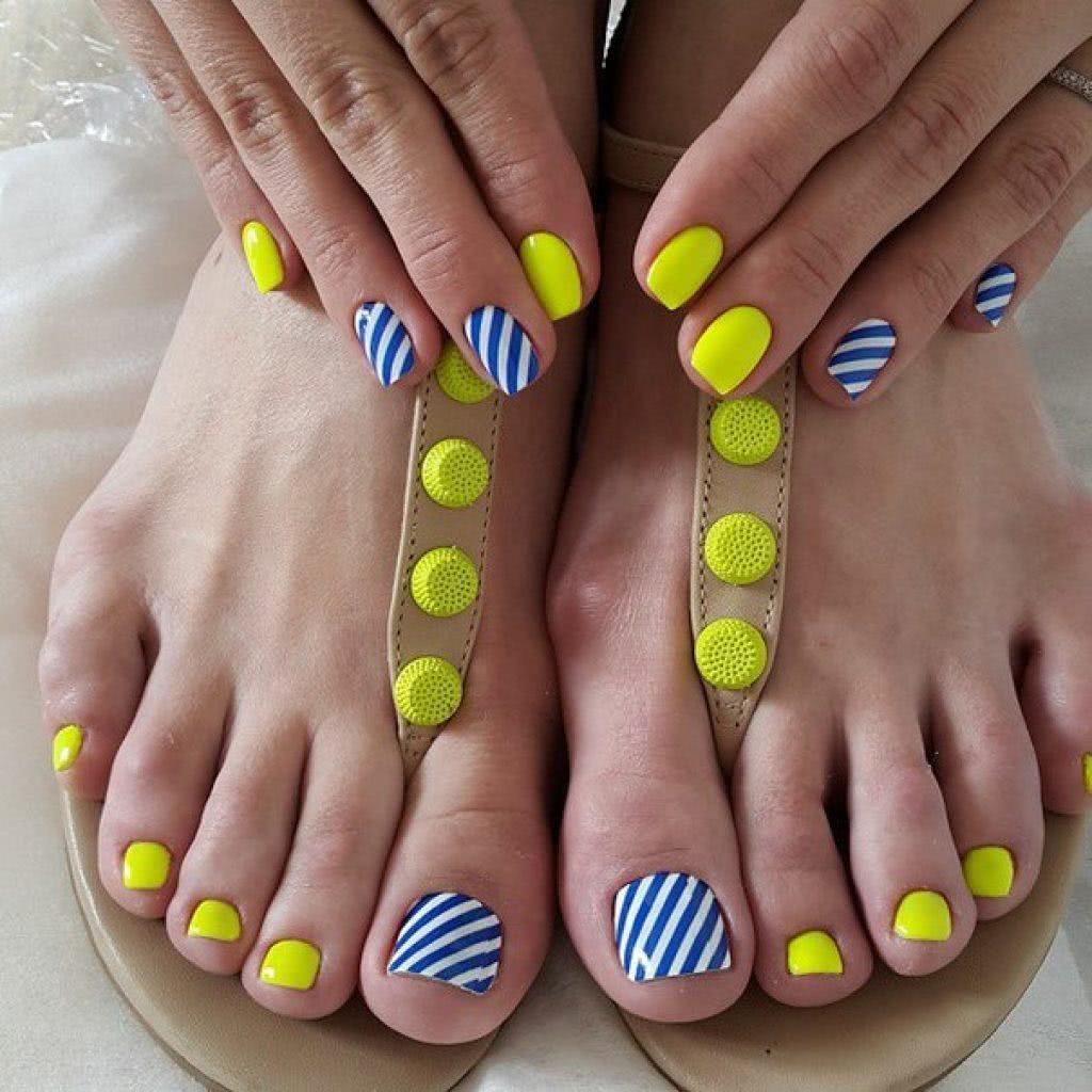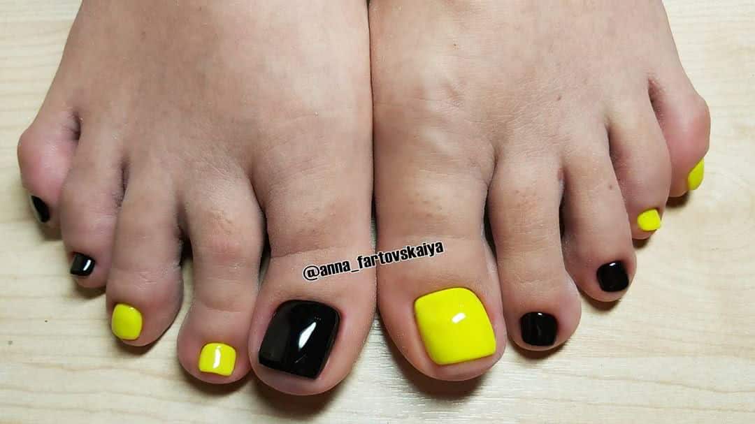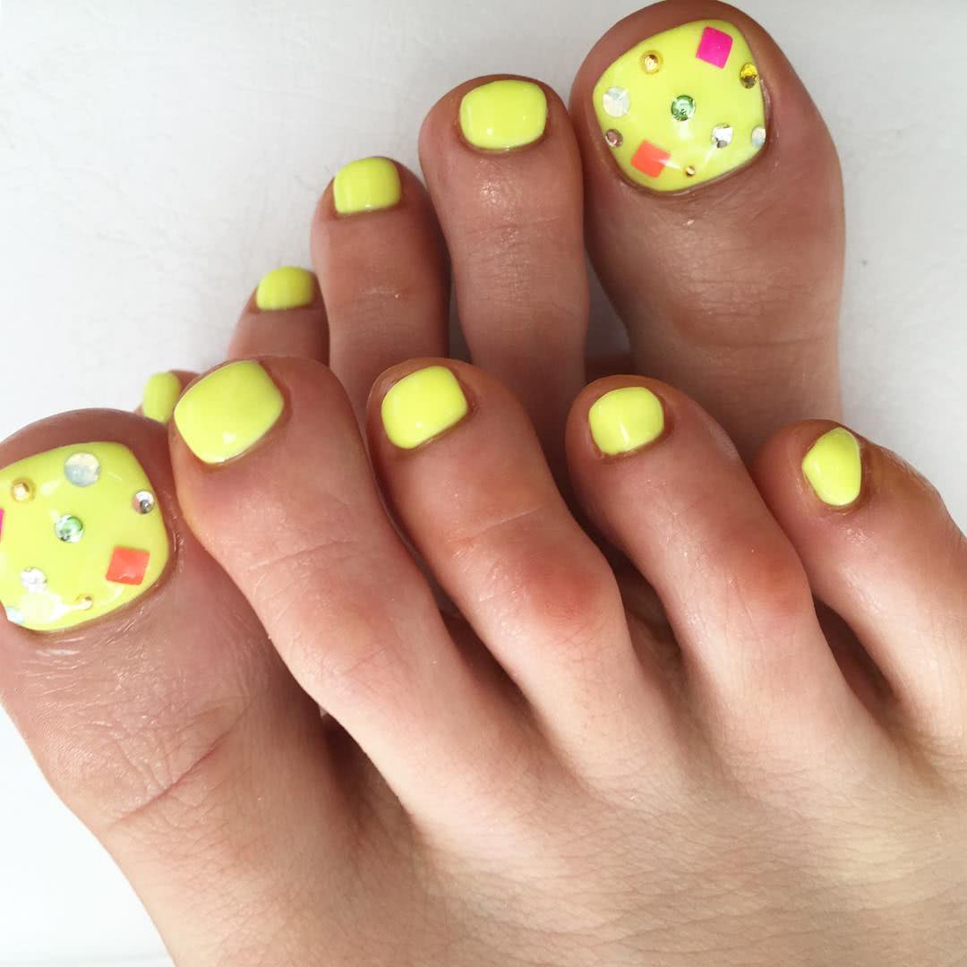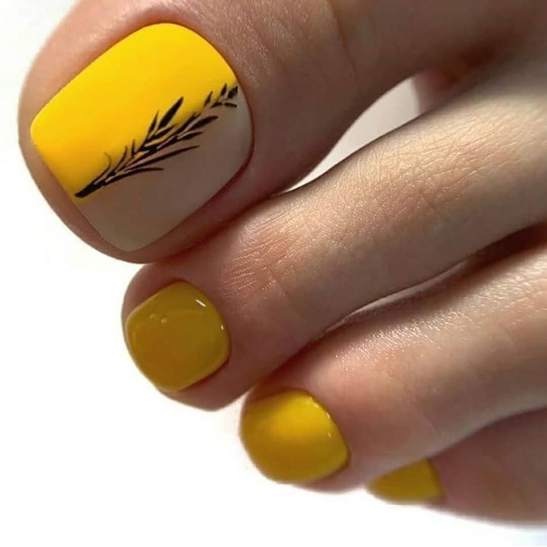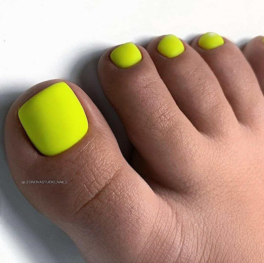 - В случае применения однотонных лаков требуется тщательный уход за ногтями на ножках и своевременная коррекция. Всё потому, что отросшая пластина, покрытая жёлтым лаком, выглядит неопрятно.