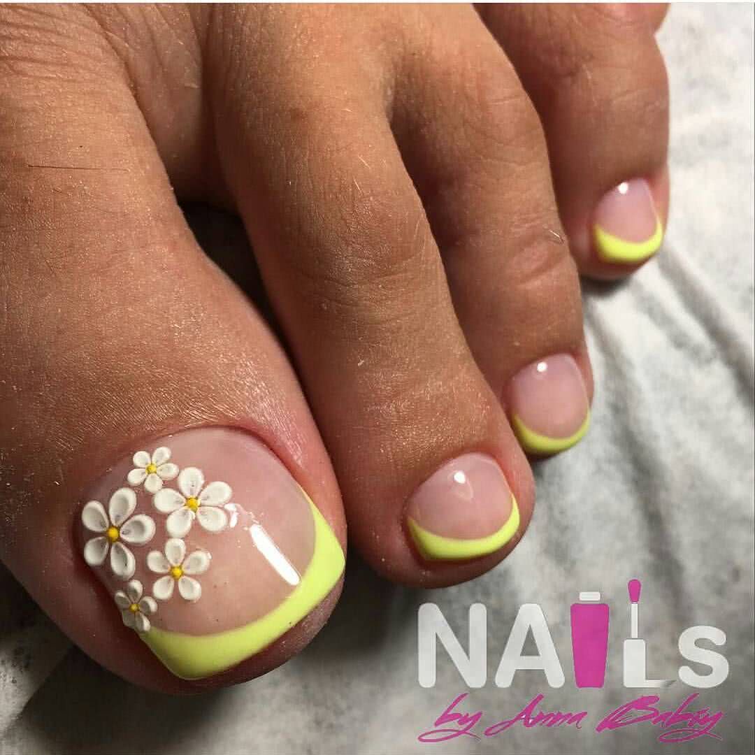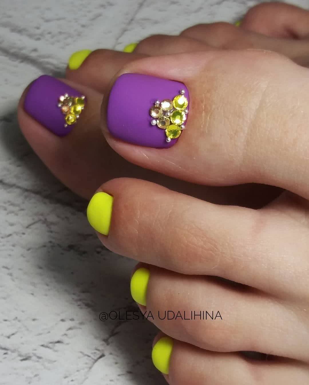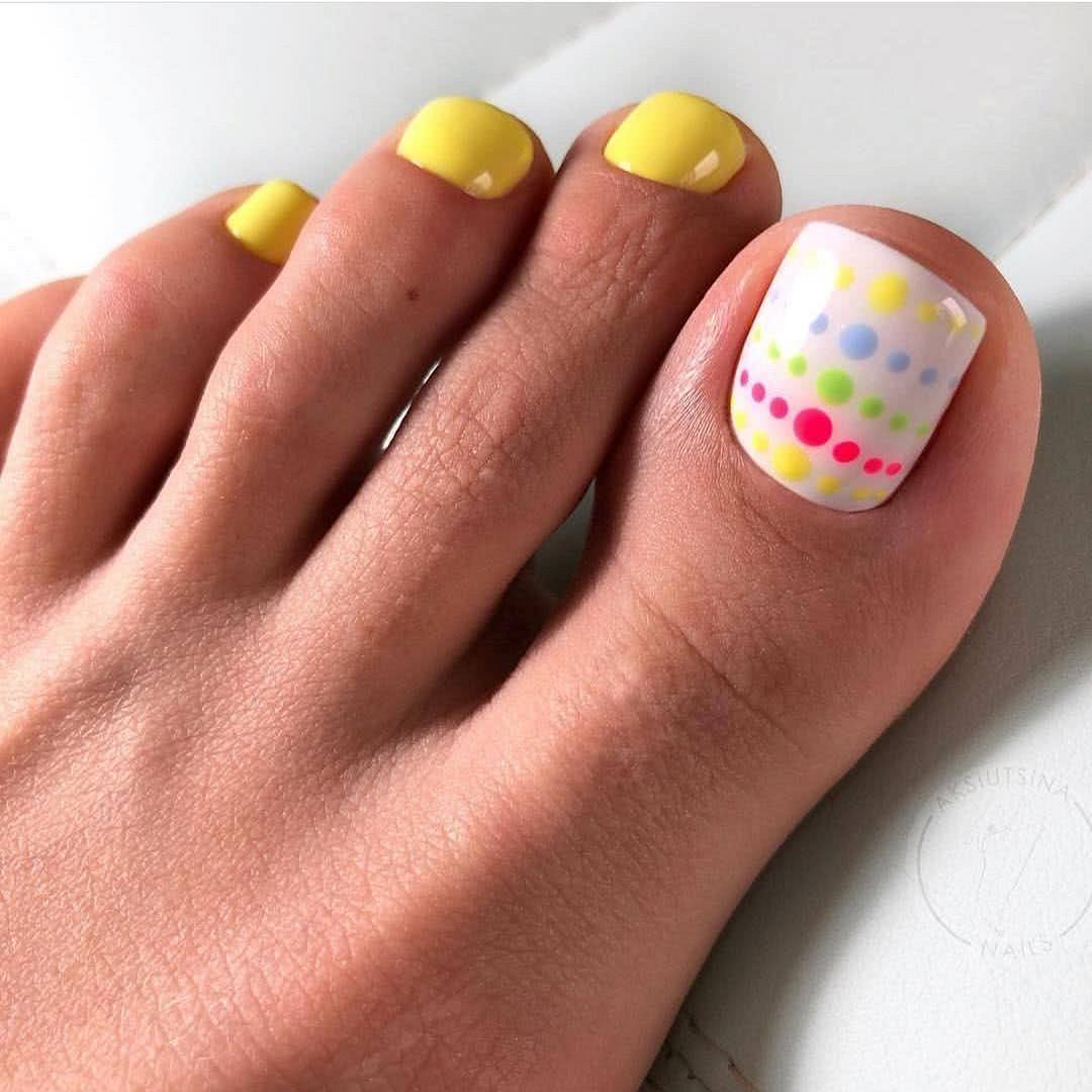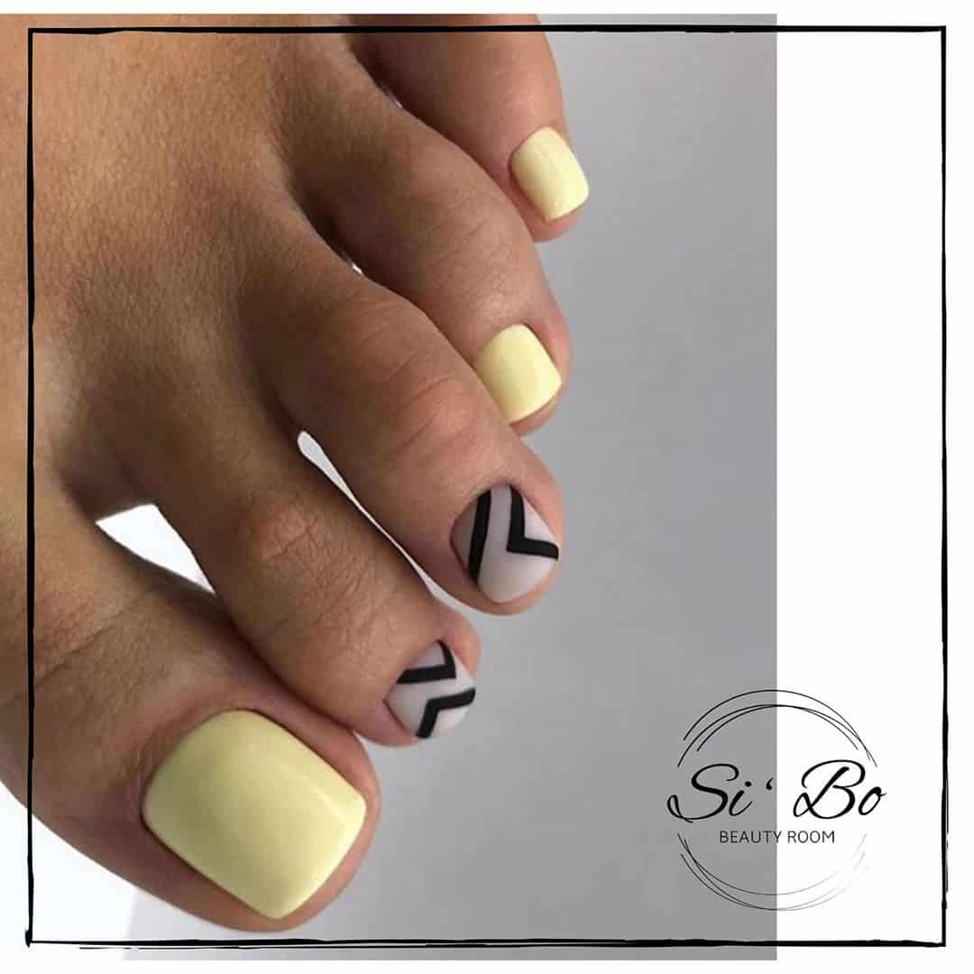 - В случае применения однотонных лаков требуется тщательный уход за ногтями на ножках и своевременная коррекция. Всё потому, что отросшая пластина, покрытая жёлтым лаком, выглядит неопрятно.