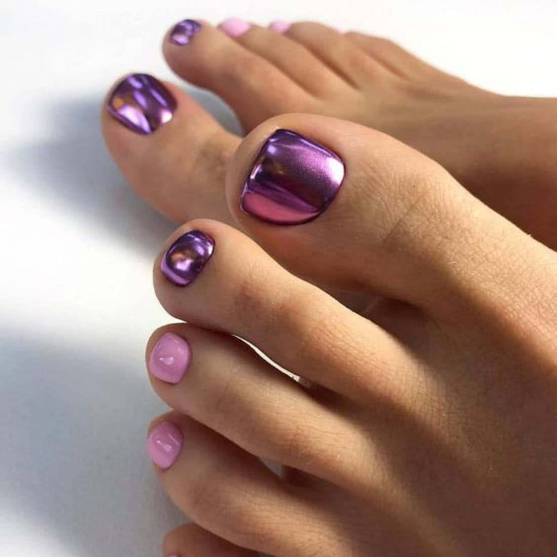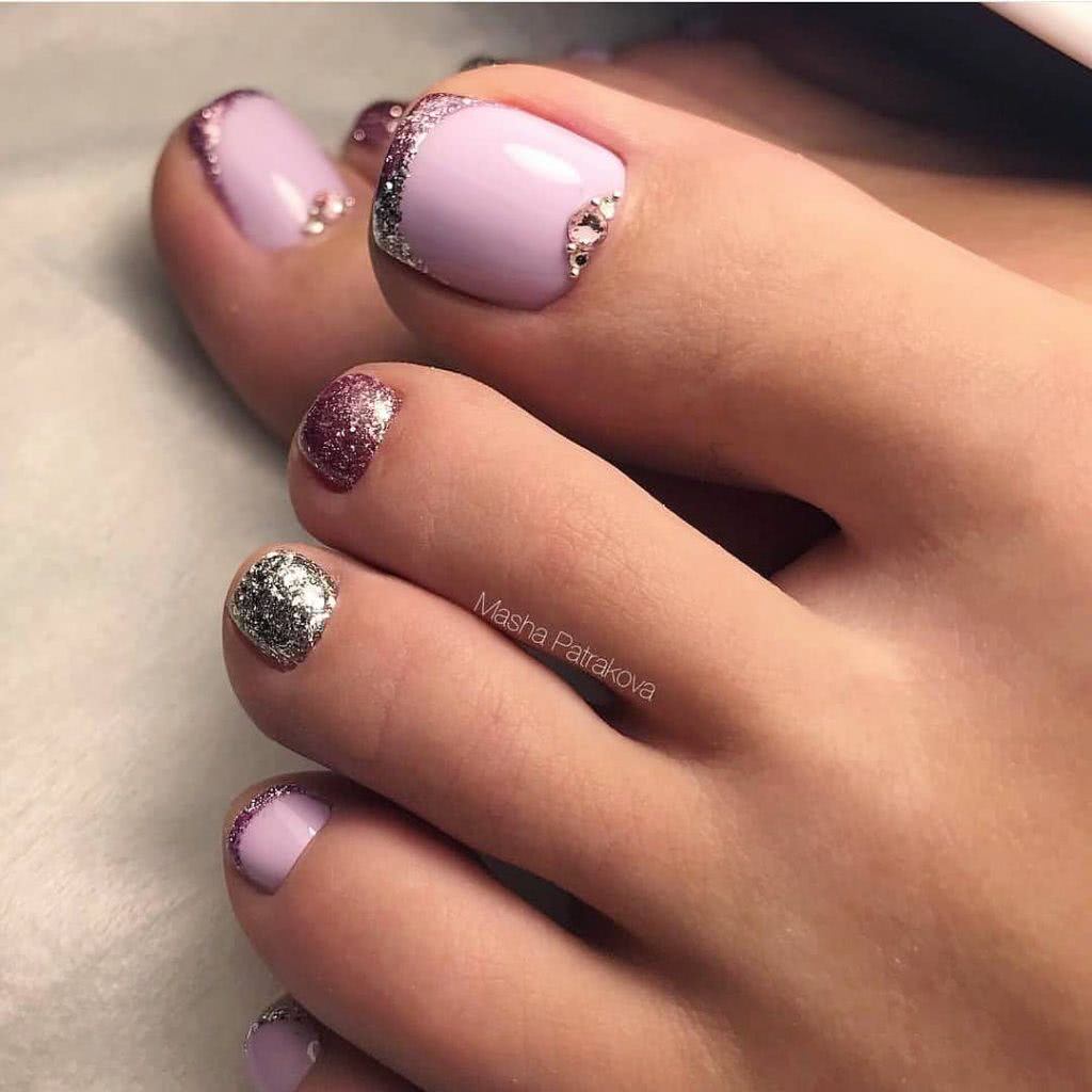 Нежные оттенки розового и сиреневого. Сочетание этих двух гамм дает большой простор для разнообразия дизайна. Чтобы получить педикюр из разных оттенков, используются персиковые, бледно-розовые, лавандовые, аметистовые лаки.
