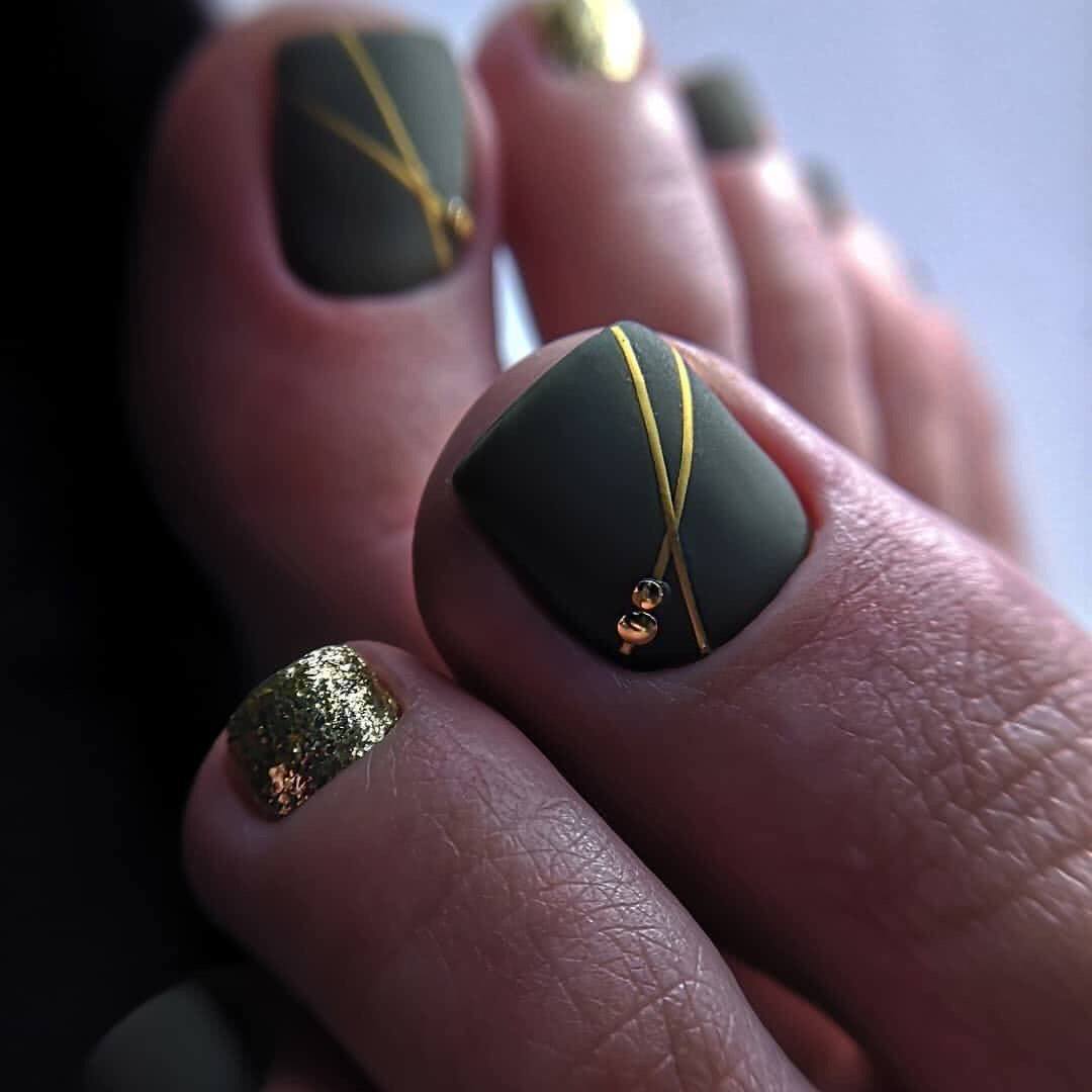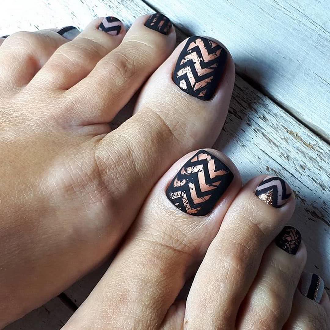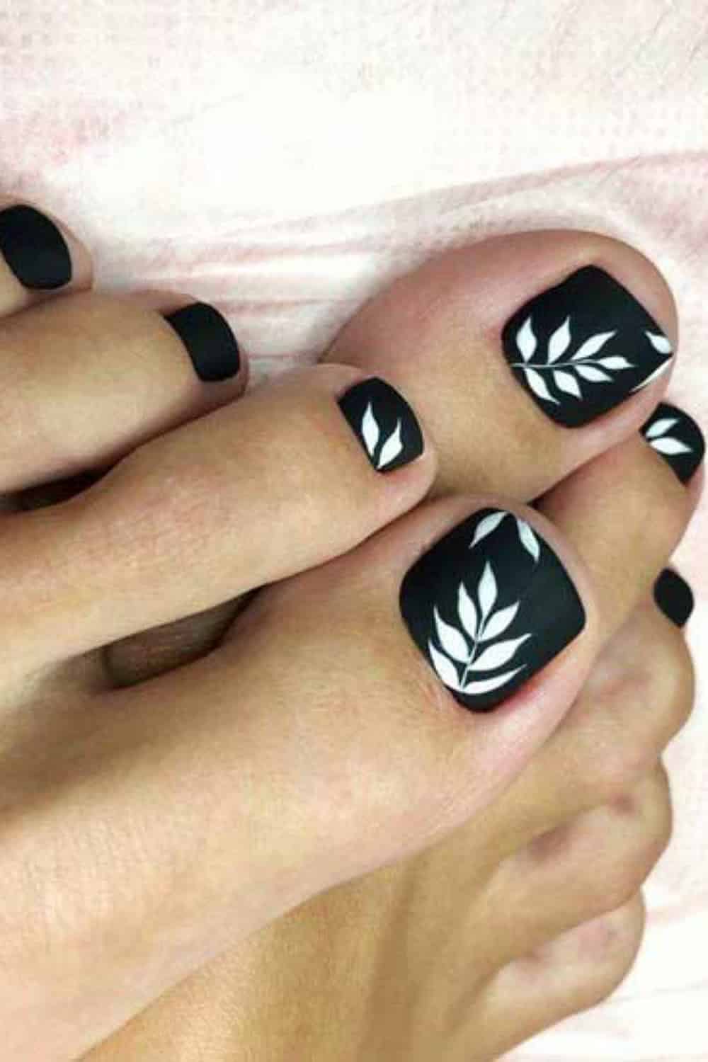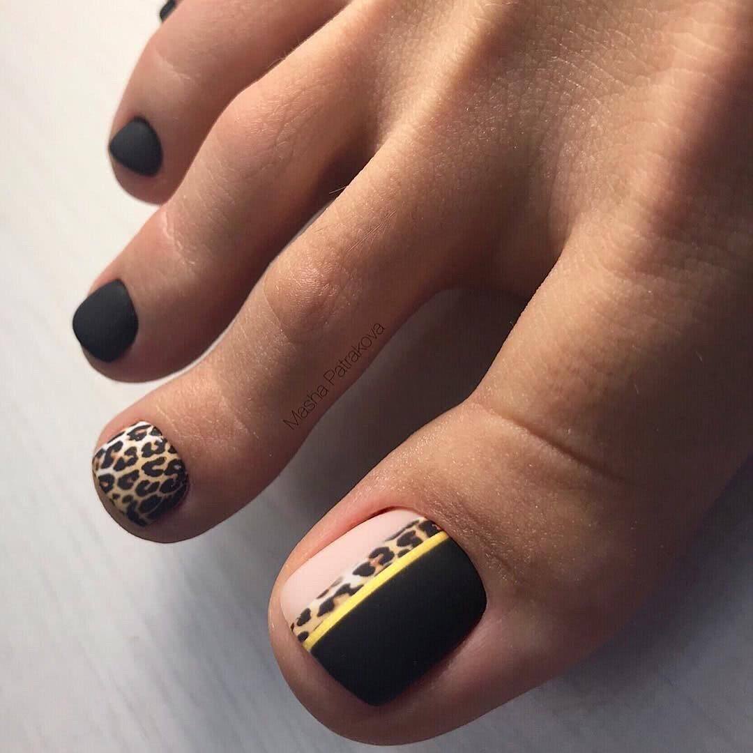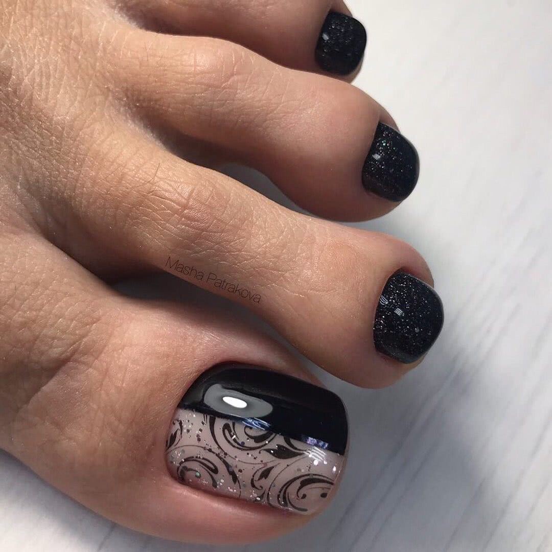 Эффектным вариантом педикюра считается дизайн, выполненный матовым покрытием, в котором присутствует черный фон и небольшой рисунок. Орнамент можно нанести только на ноготь большого пальца либо выделить несколько ногтевых пластин.