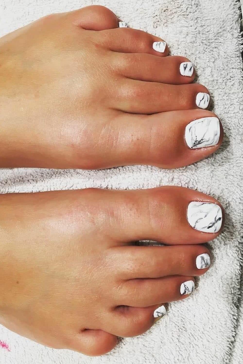 Интересно смотрится сочетание мраморного черного рисунка на белом фоне. В этом случае можно легко регулировать степень насыщенности и частоту расположения принта. При желании иметь максимально светлый педикюр можно нанести несколько тонких линий, имитирующих мрамор, оставляя как можно больше белого пространства.
