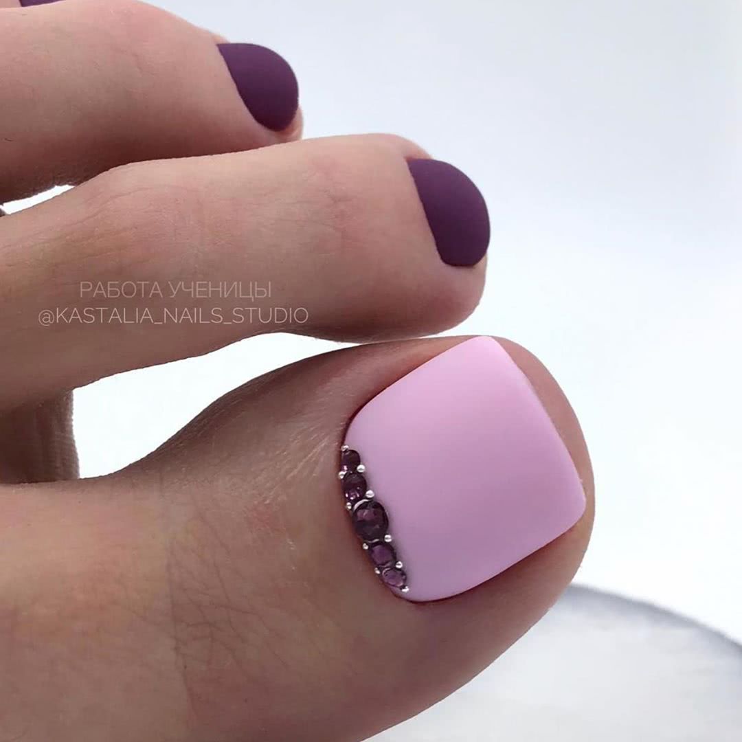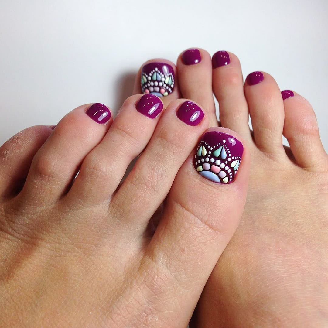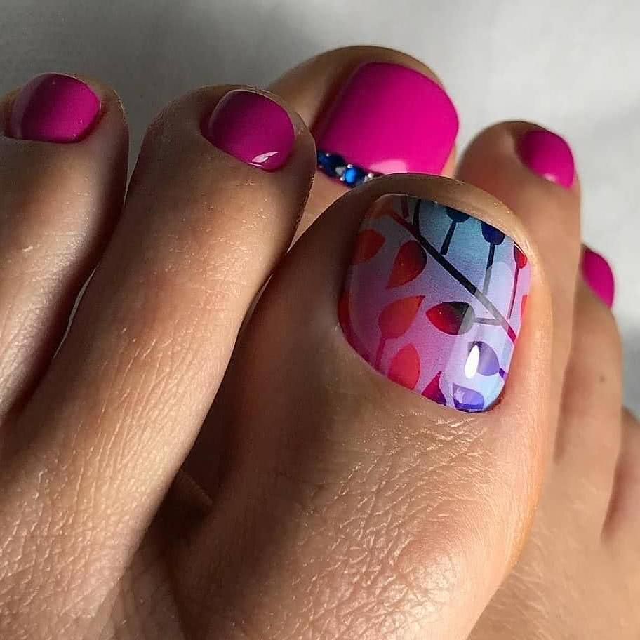 Малиновый и фуксия. Разноцветный педикюр не обязательно должен иметь несколько пестрых цветов. Дизайн может включать оттенки из одной фиолетовой или малиновой гаммы, которые отличаются насыщенностью или прозрачностью. Также красиво выглядит сочетание яркого темного цвета с его выбеленным вариантом.