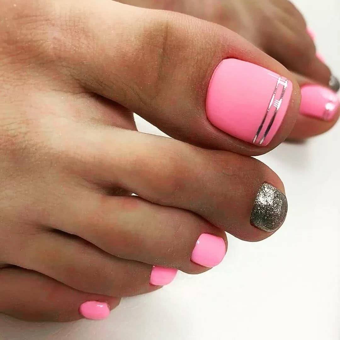 В 2021 году создание яркого стильного педикюра подразумевает не только оформление однотонных вариаций с использованием насыщенных и красочных оттенков. В оформлении могут также быть задействованы более тёмные или более спокойные оттенки. В чём же здесь заключается яркость, спросите вы? Всё очень просто. Подчеркнуть характер педикюра можно любыми оригинальными принтами и рисунками, блестящими деталями и декором. Например, наносим на ногтевые пластины пальчиков ног чёрный лак, а яркими неоновыми оттенками рисуем удивительные абстрактные мотивы или геометрические рисунки в стиле «колор блок». Не менее оригинальным решением станут яркие малиновые ногти с блестящими лунками или френч с обилием сверкающих фрагментов. Фантазия в этом случае – залог идеального педикюра!