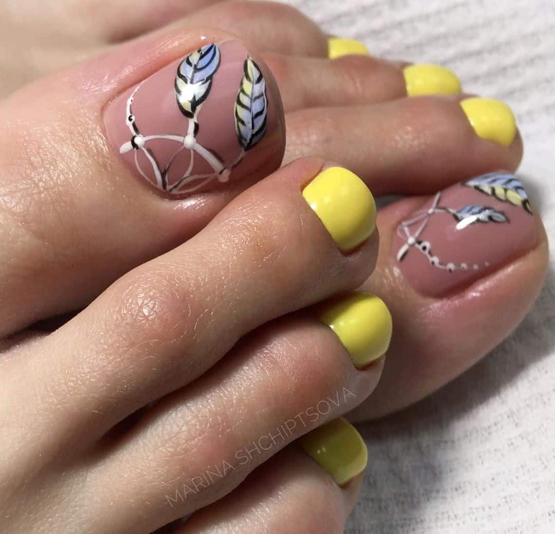 Жёлтый педикюр с оригинальным дизайном подойдёт как для делового, так и для вечернего и повседневного лука, и считается акцентным цветом в образе.