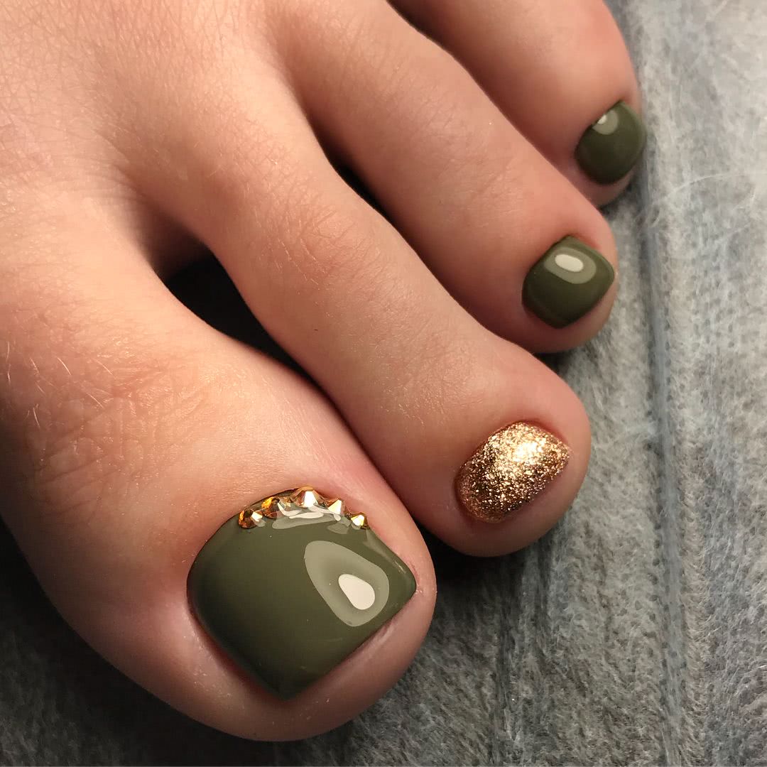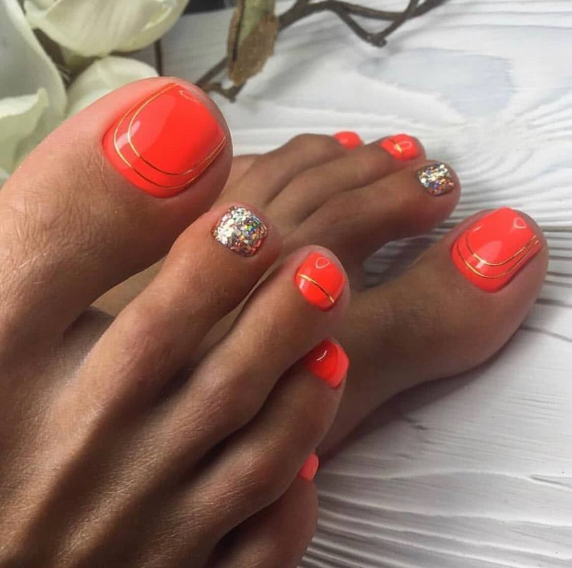 Не менее оригинальным решением будет жёлтое, молочное и изумрудное покрытие. А также разнообразные решения с полосками и принтами, золотистым дополнением, педикюр с блёстками, со стразами и втиркой. При этом любые техники можно комбинировать между собой и сочетать на пальчиках «не сочетаемое». К примеру, наносим на несколько ноготков оранжевый лак, а ногтевую пластину большого пальца покрываем контрастным чёрным или белым и дополняем композицией из камней либо рисунком.