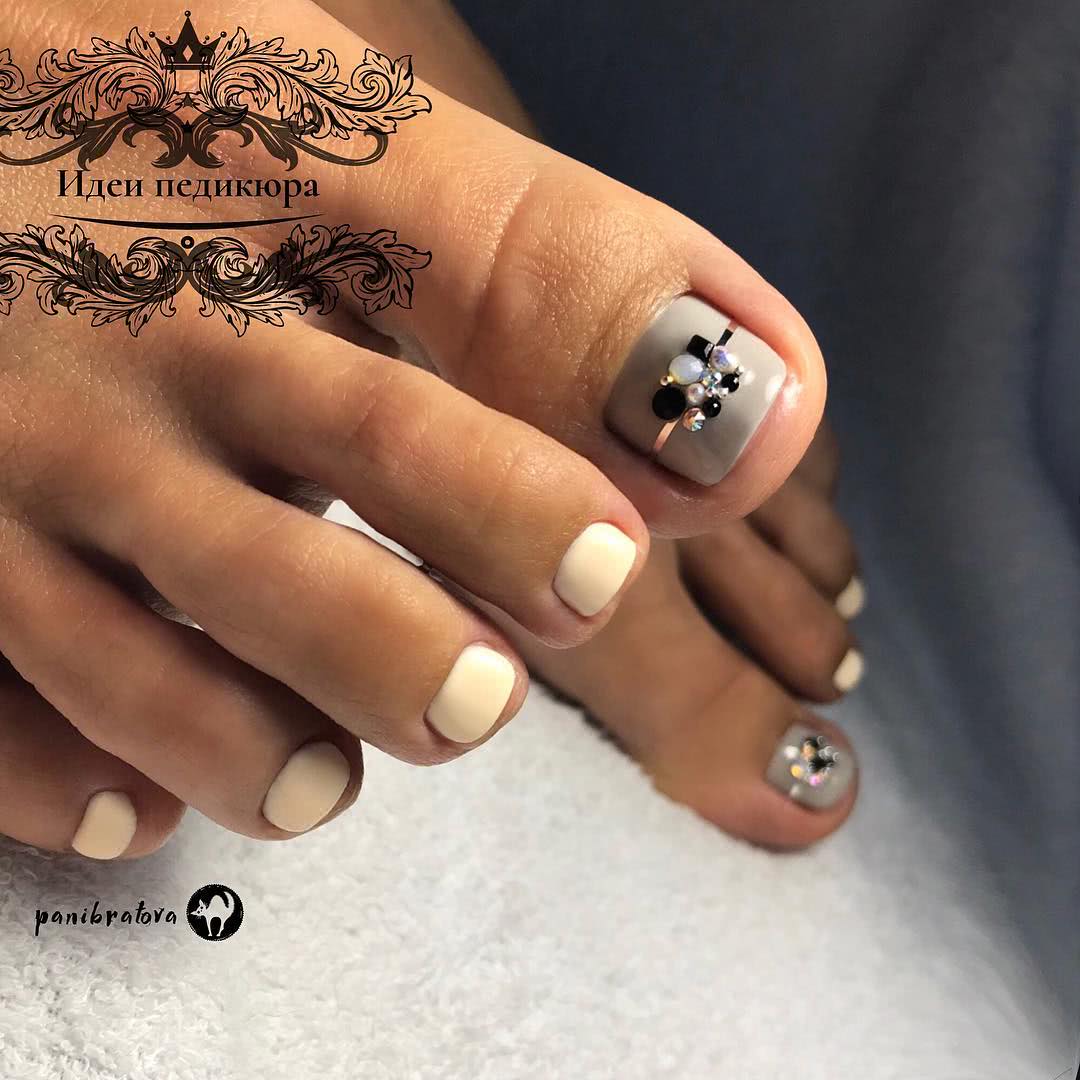 Чтобы сделать светлый педикюр более праздничным, можно добавить немного черных страз. Такой дизайн отлично смотрится в открытых босоножках на высоком каблуке.