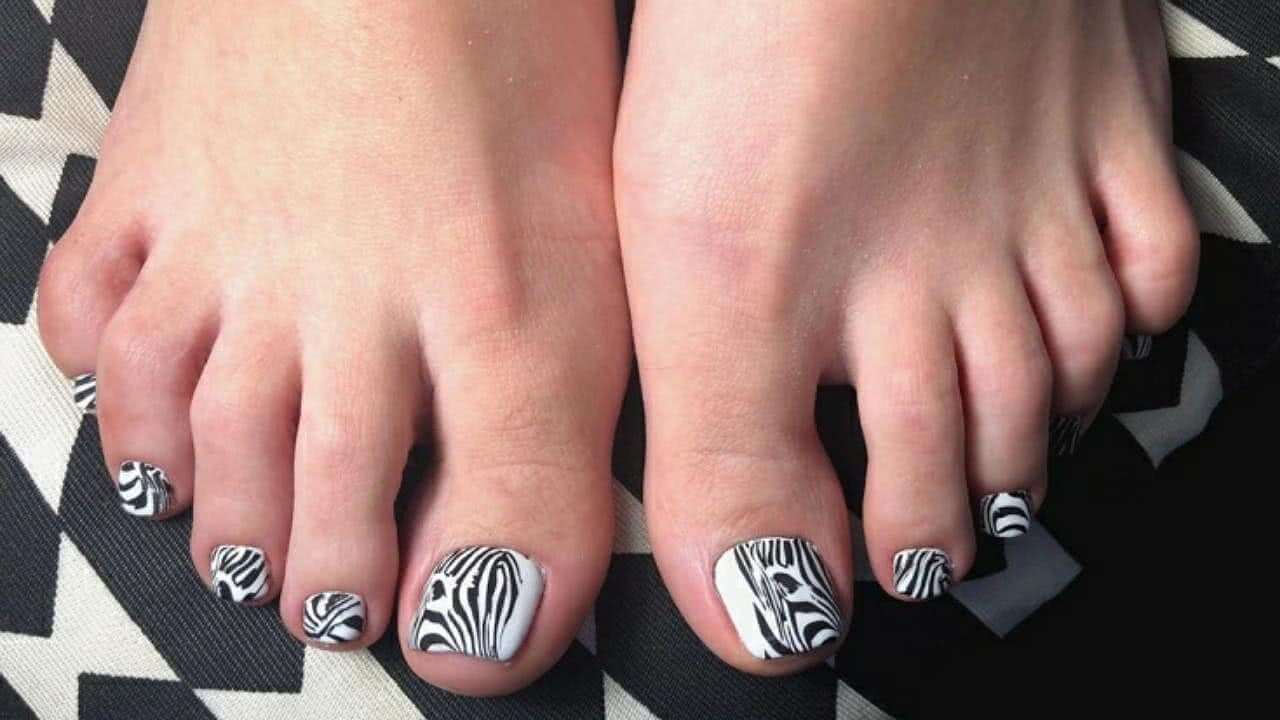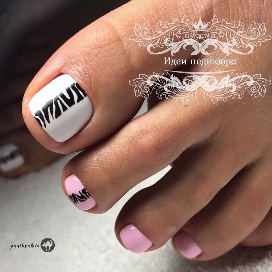 Довольно популярная идея в черно-белом спектре — это принт в виде полосок зебры. Такой рисунок подходит для летнего дизайна и сочетается практически с любой открытой обувью.