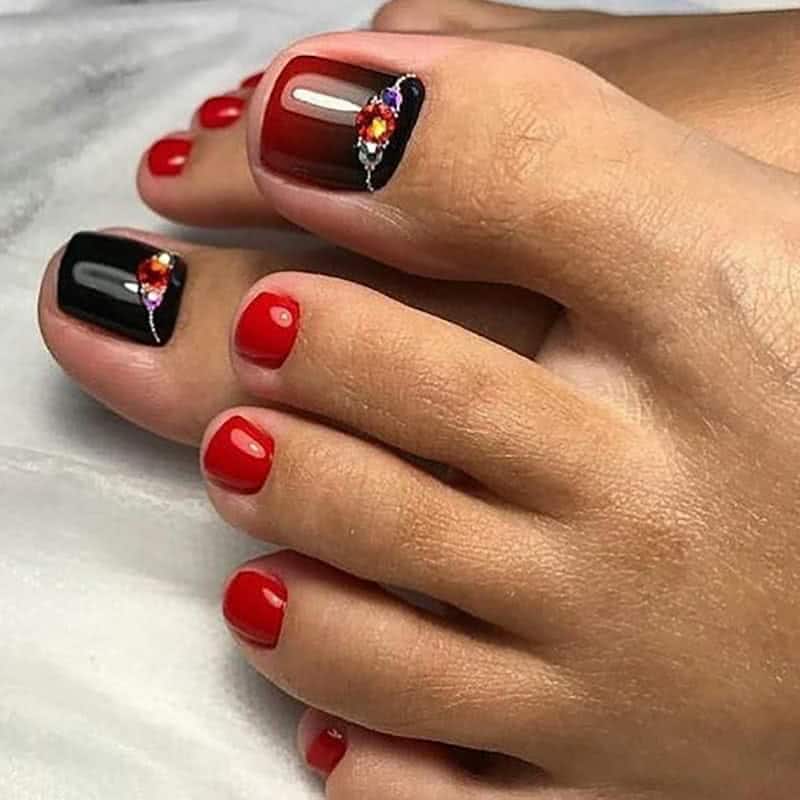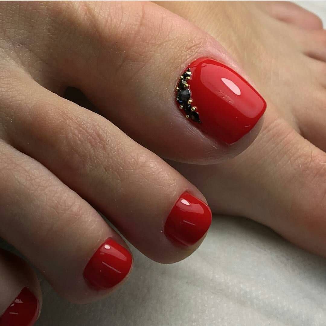 Сочетание черного и красного с успехом используется в маникюре для создания геометрических и других нейл-артов. Тандем этих оттенков действительно выглядит необычно и ярко. Что касается педикюра, то есть несколько вариантов декора ногтей: