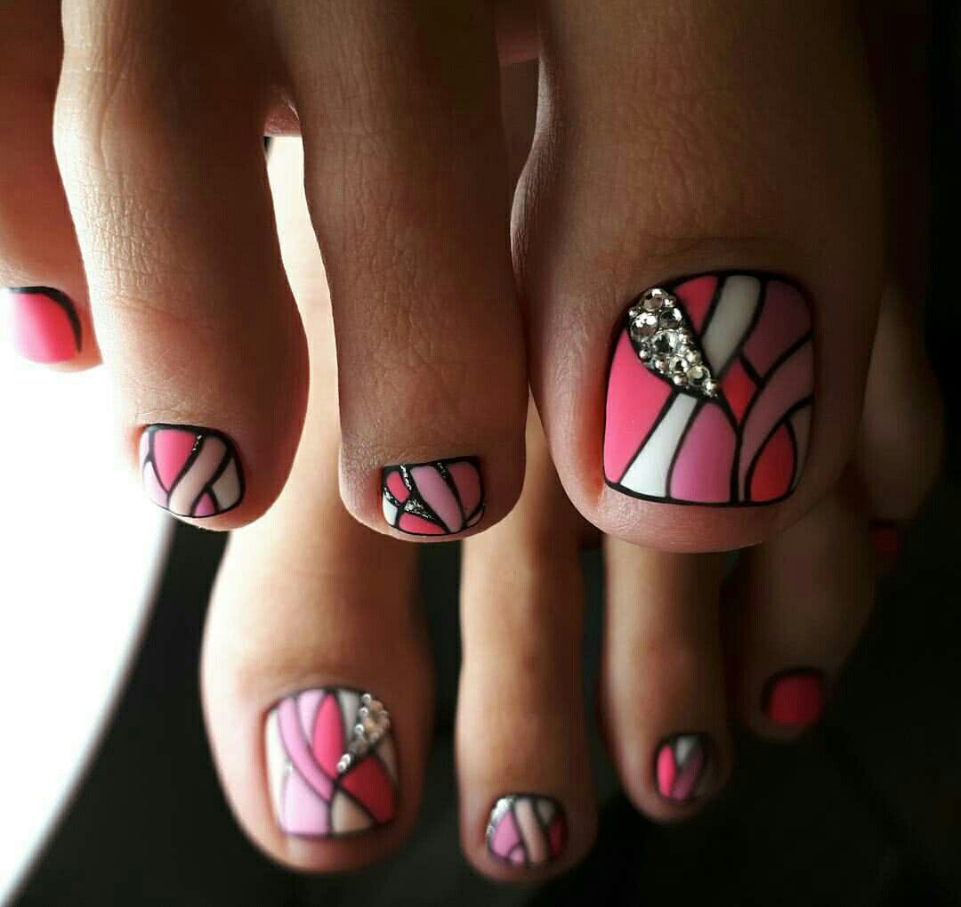 При таком оформлении, главное — не переборщить с количеством, иначе декор получится грубым и неаккуратным. Элементы различных форм и размеров можно выложить хаотично или в форме конкретного узора. Черный педикюр замечательно смотрится не только с белыми, но и цветными камнями. Такой стиль будет более уместен для весеннего или летнего педикюра. Оформите край ногтя тонкой линией из цветных камней и получите стильный дизайн.