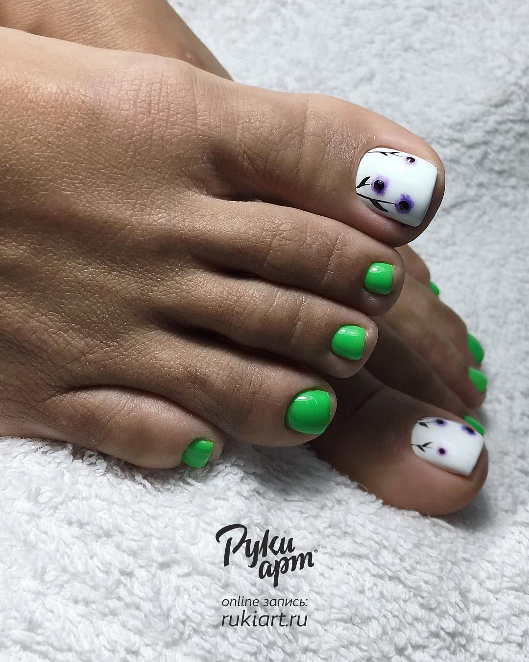 Классический контраст, яркий и гармоничный. Педикюр в этих тонах подойдет к классической одежде, дополнит элегантный и стильный образ. Белый акцент не обязателен на всех ногтях, достаточно его наличие на ногте большого пальца. Например, это могут быть крупные белые цветы на черном фоне, линии и полосы, геометрические фигуры, узоры, забавные персонажи, надписи.