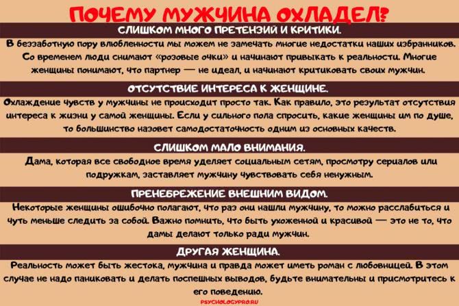 Прежде всего разберемся, как понять, что парень действительно охладел к тебе. В первую очередь, женщинам следует руководствоваться своей интуицией — она вас не подведет, особенно если кричит о том, что мужчина равнодушен к вам. Кроме того, разберитесь в ваших отношениях и общении в целом, а после этого сравните наблюдения со списком признаков того, что муж охладел к жене и отношениям приходит конец: