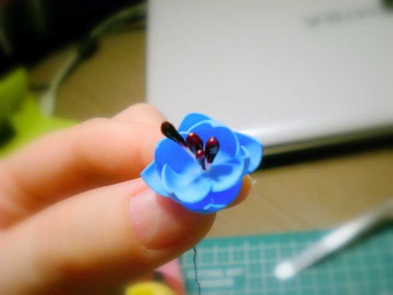 - В центре шилом делается отверстие, в которое вставляются и приклеиваются тычинки.