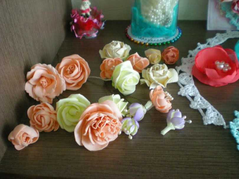 - Удобная обработка. Фоамиран легко поддается резке, прокалыванию, тиснению. Это делается легко и без определенных усилий. Большие цветы украшают бусинами, бабочками, пришивая или приклеивая декоративные элементы.