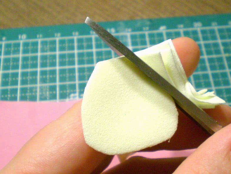 - Пластичность фоамирана позволяет создавать уникальные формы для цветов. Форма придается путем нагрева. Чтобы придать детали скрученную форму, заготовку нужно нагреть – прислонить к плойке, утюгу или любому другому нагревательному элементу. Материал имеет «память», поэтому скрученная форма зафиксируется благодаря теплу и останется такой навсегда.