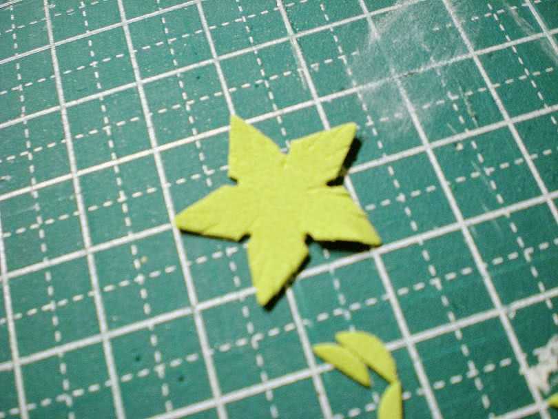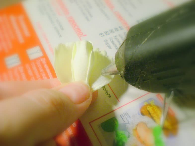 Первый лист клеится прямо к проволоке. К нему крепят второй так, чтобы проволочку не было видно. На нижнюю часть бутона крепиться клеевым составом подложка, еще три листочка приклеивают к проволоке без фама. Вся ветка обматывается тонким зеленым отрезком. Изделие готово.