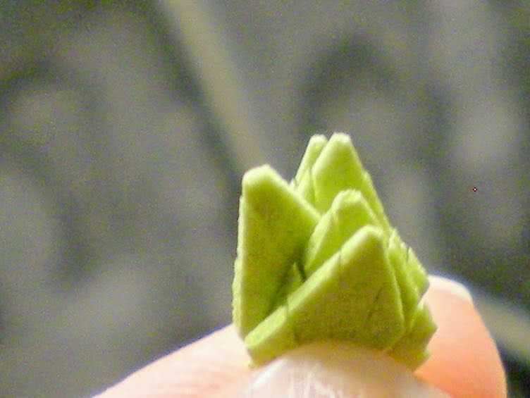 На каплеобразную заготовку приклеивается три лепестка плотно, чтобы получился нераскрывшийся бутончик.