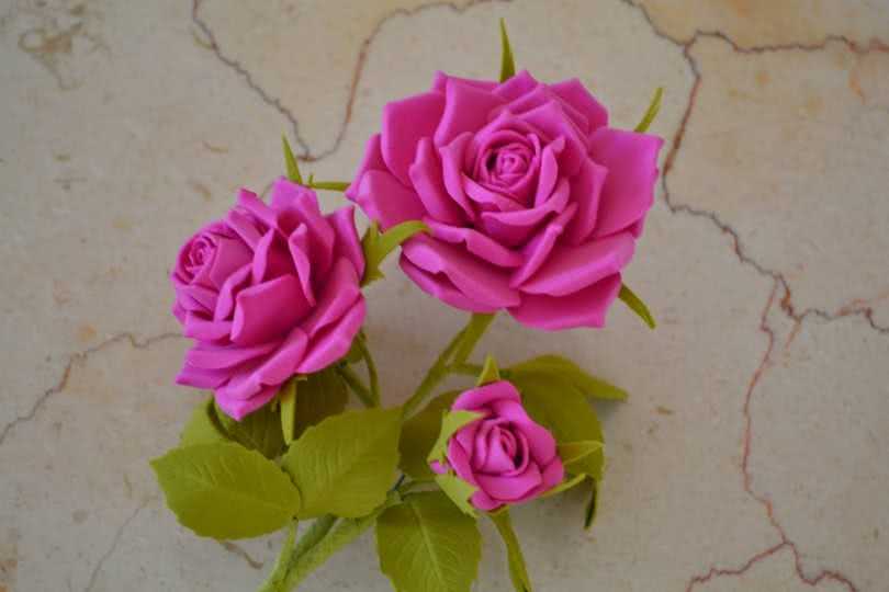 В продаже можно встретить 22-24 цвета фоамирана. Они позволяют получить в готовом изделии практически все оттенки известных сортов цветов. Сложную окраску выполняют с помощью красок. Сам материал устойчив к влаге, но и чувствителен к высокой температуре. Если вы планируете сделать букет, который будет летом находиться на солнцепеке, это не лучшая идея. Но в другое время такие цветы могут использоваться на улице и в интерьере.