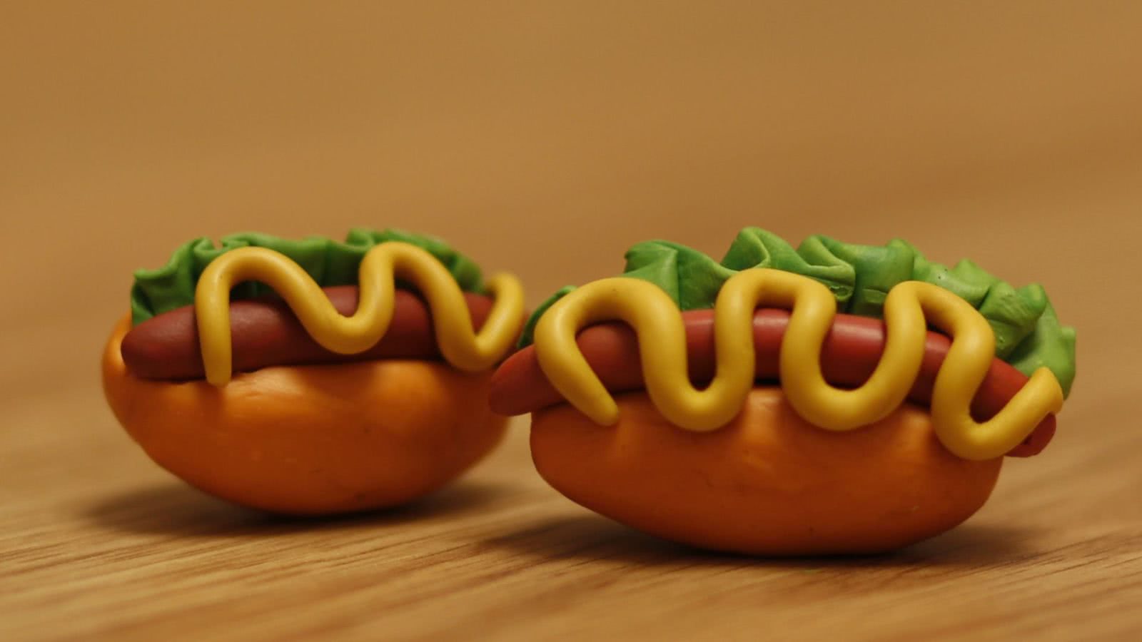 Сделайте из светло-коричневого кусочка толстую лепешку и слегка сверните её. Внутрь кладется тонкий зеленый пласт, жгутик красно-бордового цвета, а сверху — небольшая “колбаска” горчицы из желтого материала. Готово!